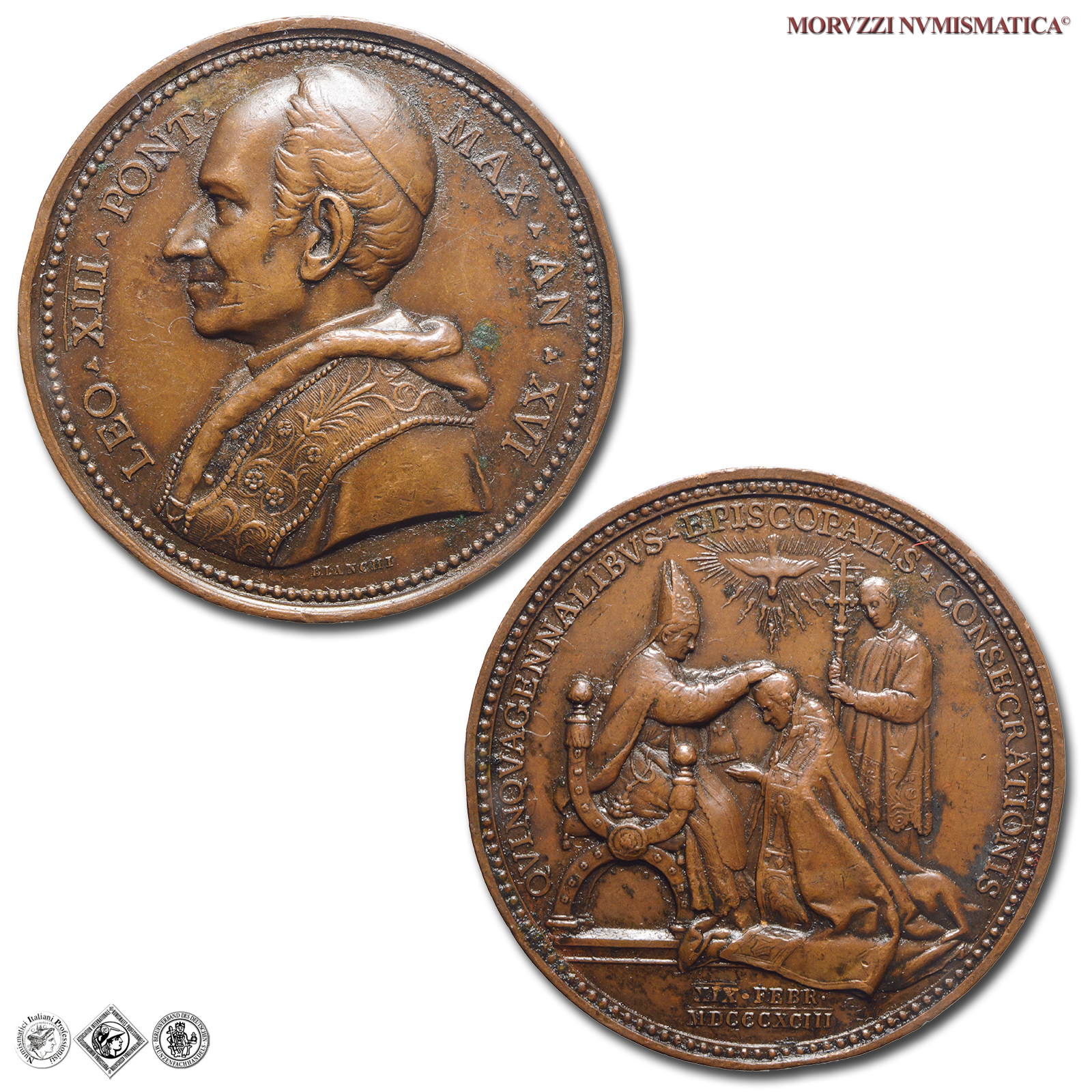 Stato Pontificio, LEONE XIII, Pecci, MEDAGLIA ANNUALE IN BRONZO, 50° anniversario della consacrazione episcopale, 1893 AN XVI, Opus Bianchi, SPL, (R), (Bartolotti E893) / medaglie papali pontificie annuali rare da collezione