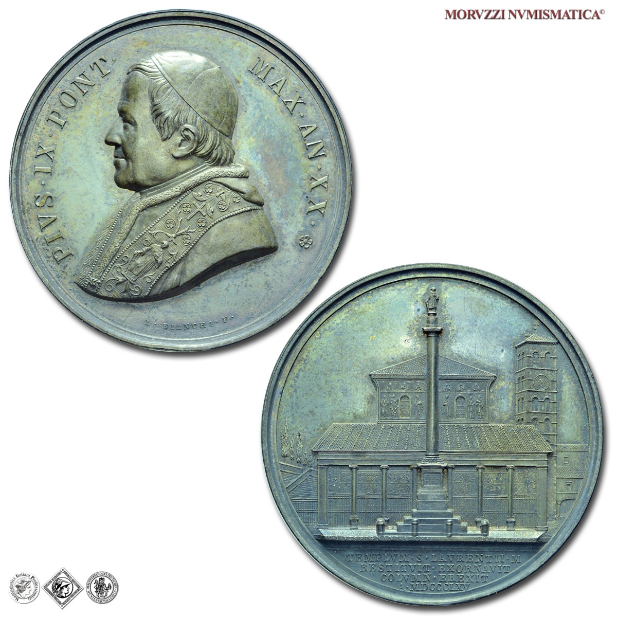 Stato Pontificio, PIO IX, Mastai Ferretti, MEDAGLIA ANNUALE IN ARGENTO, 1865 AN XX, Erezione della colonna a San Lorenzo fuori le mura, Opus Ignazio Bianchi, FDC, (Bartolotti E865) / medaglie papali pontificie d'argento