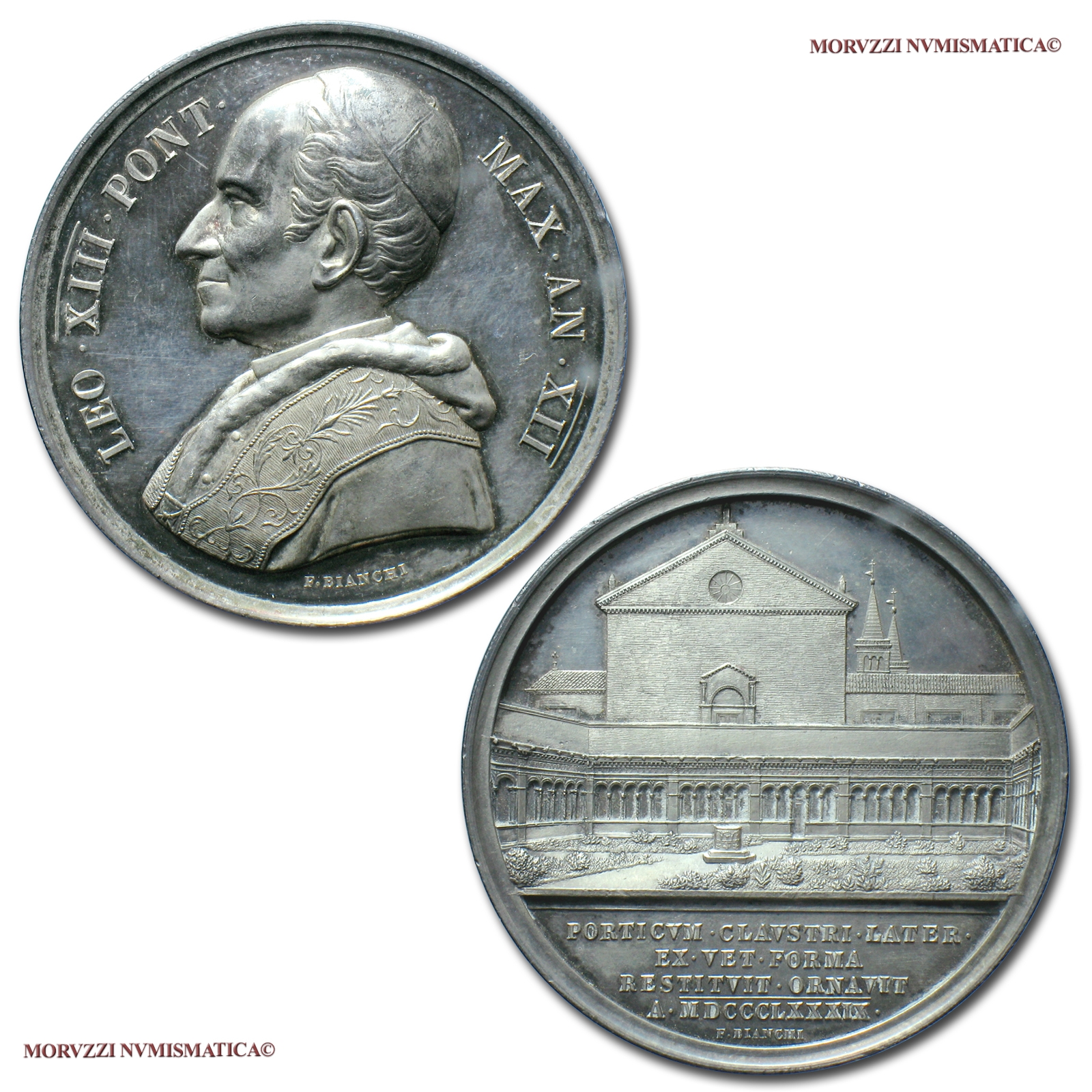 Stato Pontificio, LEONE XIII, MEDAGLIA ANNUALE IN ARGENTO, 1889 AN XII, Restauri al Chiostro Lateranense, Opus Francesco Bianchi, FDC, (R), (Bartolotti E889) Pope Leo XIII Pecci SILVER MEDALS (medaglie papali rare d'argento - medaglie pontificie annuali)