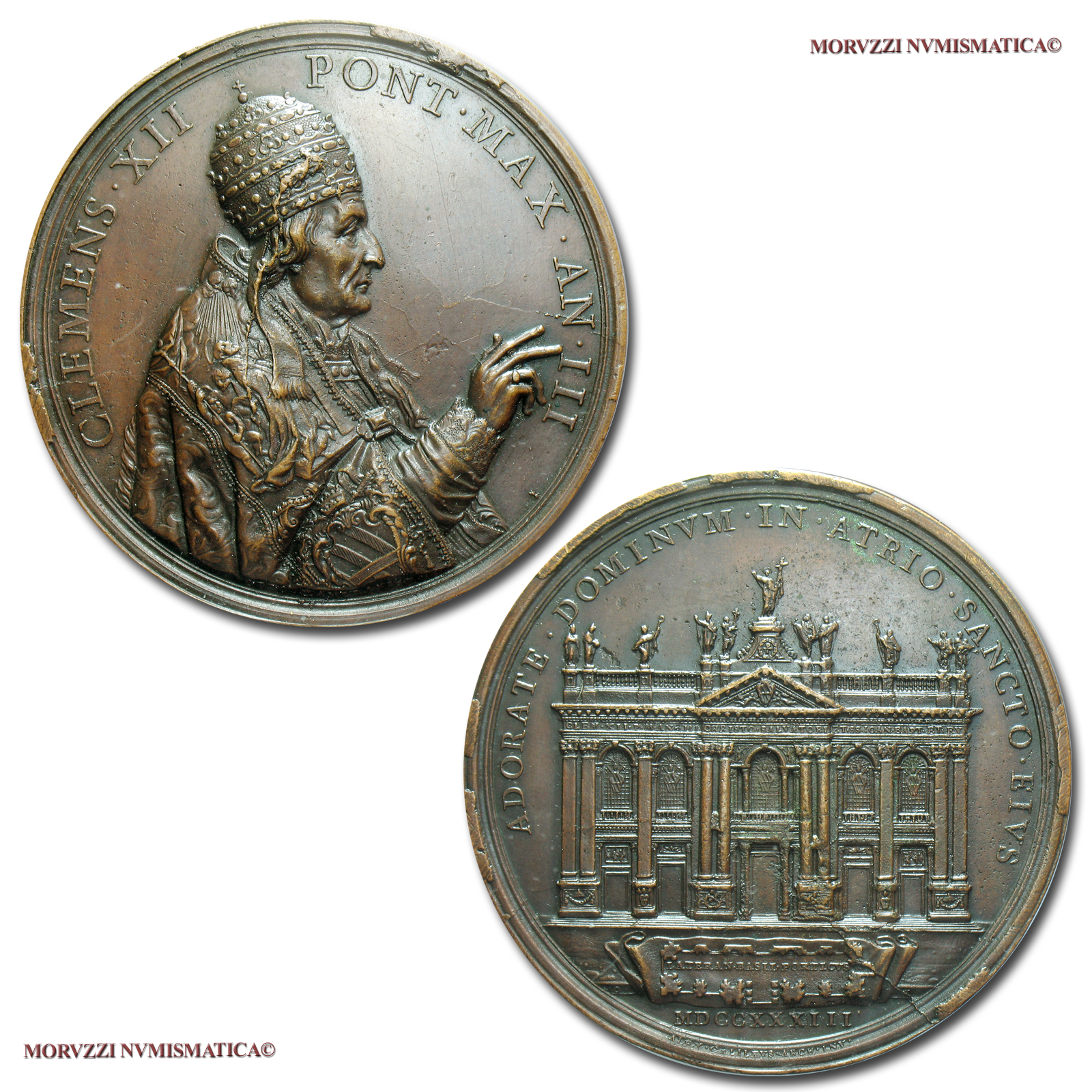 Stato Pontificio, CLEMENTE XII, MEDAGLIA STRAORDINARIA IN BRONZO, AN III, Il nuovo portico della Basilica Lateranense, Opus Ermenegildo e Ottone Hamerani, SPL, (R), (Patrignani 19a) Clemens XII Corsini BRONZE MEDALS (medaglie papali - medaglie pontificie)
