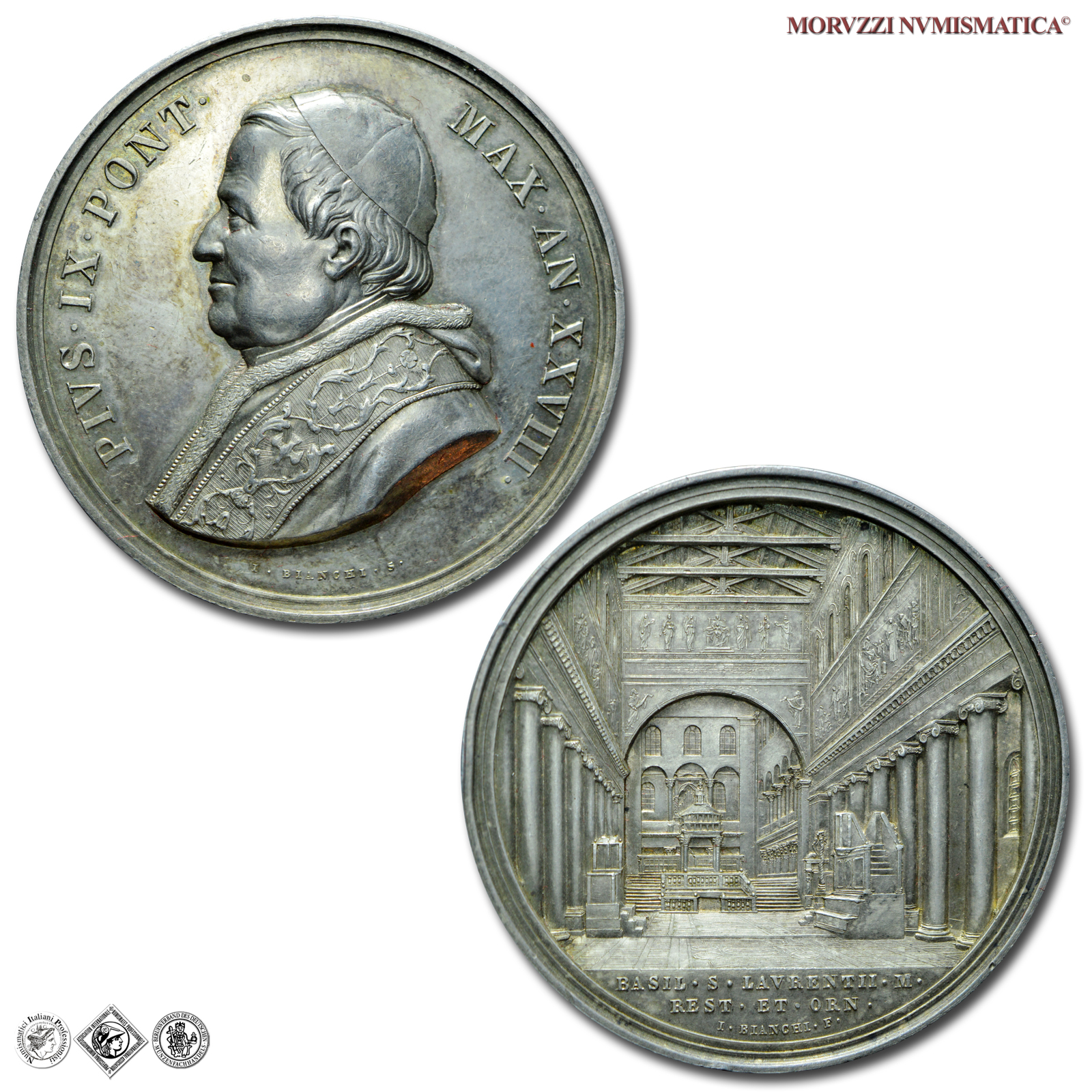 Stato Pontificio, PIO IX, Mastai Ferretti, MEDAGLIA ANNUALE IN ARGENTO, 1873 AN XXVIII, Restauro della Basilica di San Lorenzo fuori le mura, Opus Ignazio Bianchi, qFDC, (R), (Bartolotti E873) / medaglie papali pontificie annuali rare d'argento