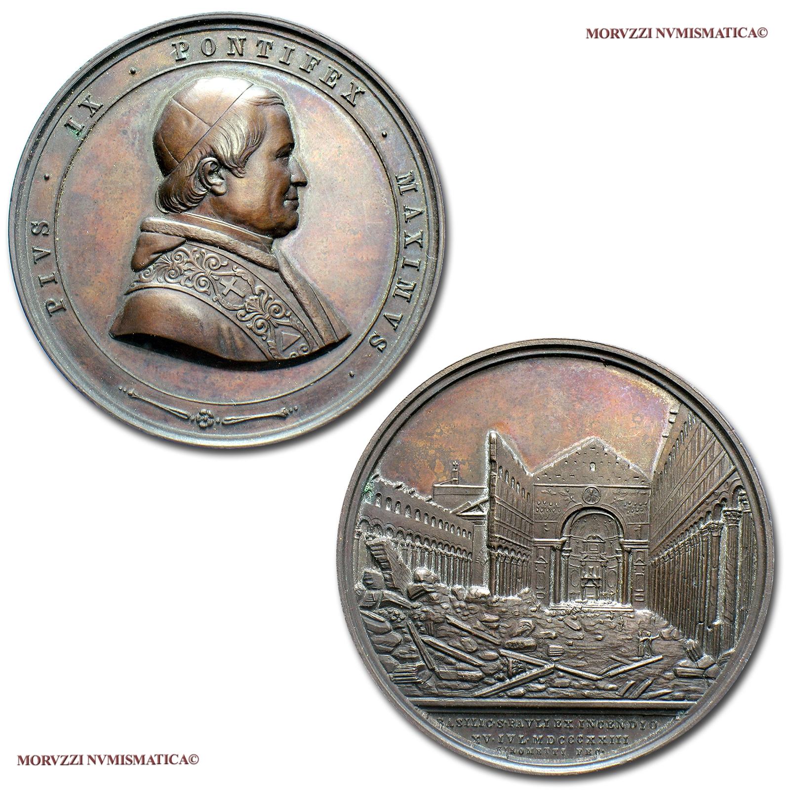 Stato Pontificio, PIO IX, MEDAGLIA ANNUALE IN BRONZO, 1823, Distruzione Basilica di San Paolo fuori le mura, Opus G. Cerbara e G. Girometti, FDC, (Bartolotti SD43a) / Pope Pius IX BRONZE MEDAL Papal medals (medaglie papali di bronzo - medaglie pontificie)