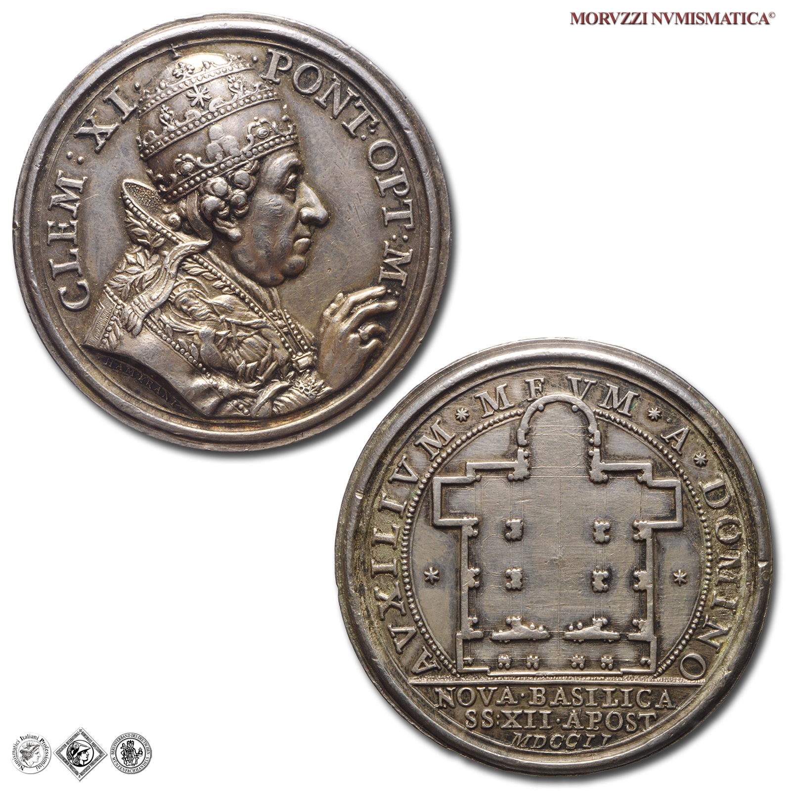 Stato Pontificio, CLEMENTE XI, Albani, MEDAGLIA STRAORDINARIA IN ARGENTO, Basilica SS. Apostoli, 1702, Opus Giovanni Hamerani, qSPL, (RR), (Miselli 25) / medaglie papali pontificie straordinarie rare d'argento
