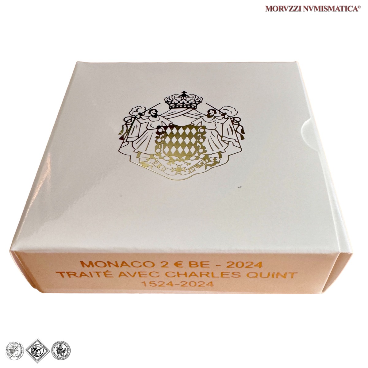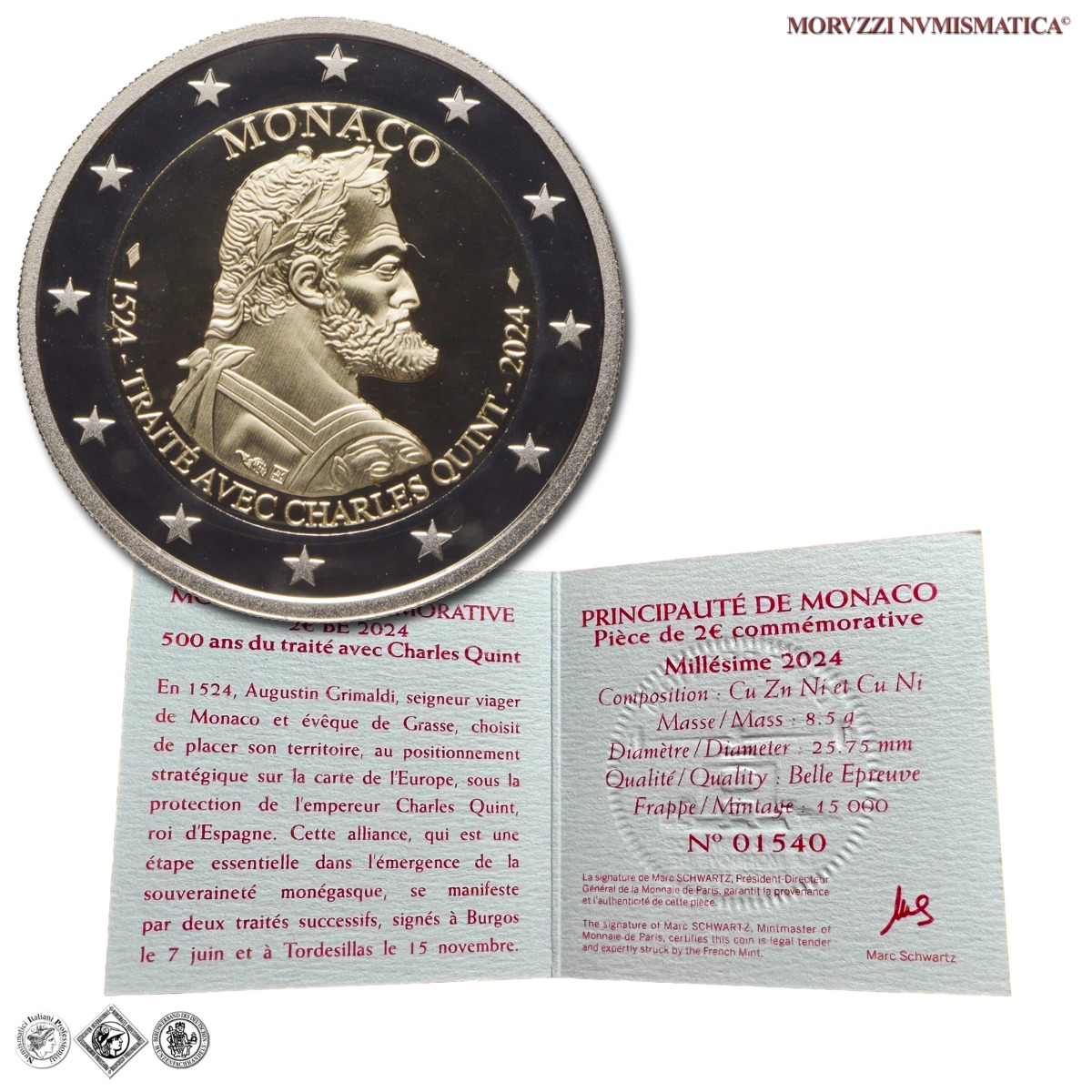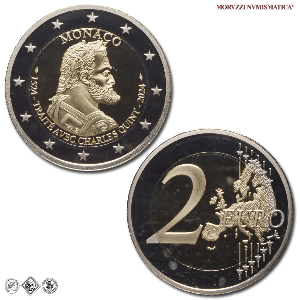 Principato di Monaco, ALBERTO II, Dal 2005, 2 EURO, Emissione: 2024, 500° anniversario del Trattato di Burgos - Carlo V, moneta bimetallica da 2 euro, nell'astuccio originale corredato da certificato di garanzia numerato, D/ La parte interna della moneta reca, al centro, il ritratto laureato dell'imperatore Carlo V rivolto a destra. In alto: MONACO; in basso, tra i rombi: 1524 - TRAITÉ AVEC CHARLES QUINT - 2024. Sul bordo esterno 12 stelle a cinque punte rappresentanti l'Unione Europea, R/ 2 EURO, mappa dell'Unione Europea e le 12 stelle dei paesi fondatori della moneta unica; LL nella parte esterna, Zecca di Parigi; Metallo: CU/NI, gr. 8,50, Diam.: mm. 25,75, FS