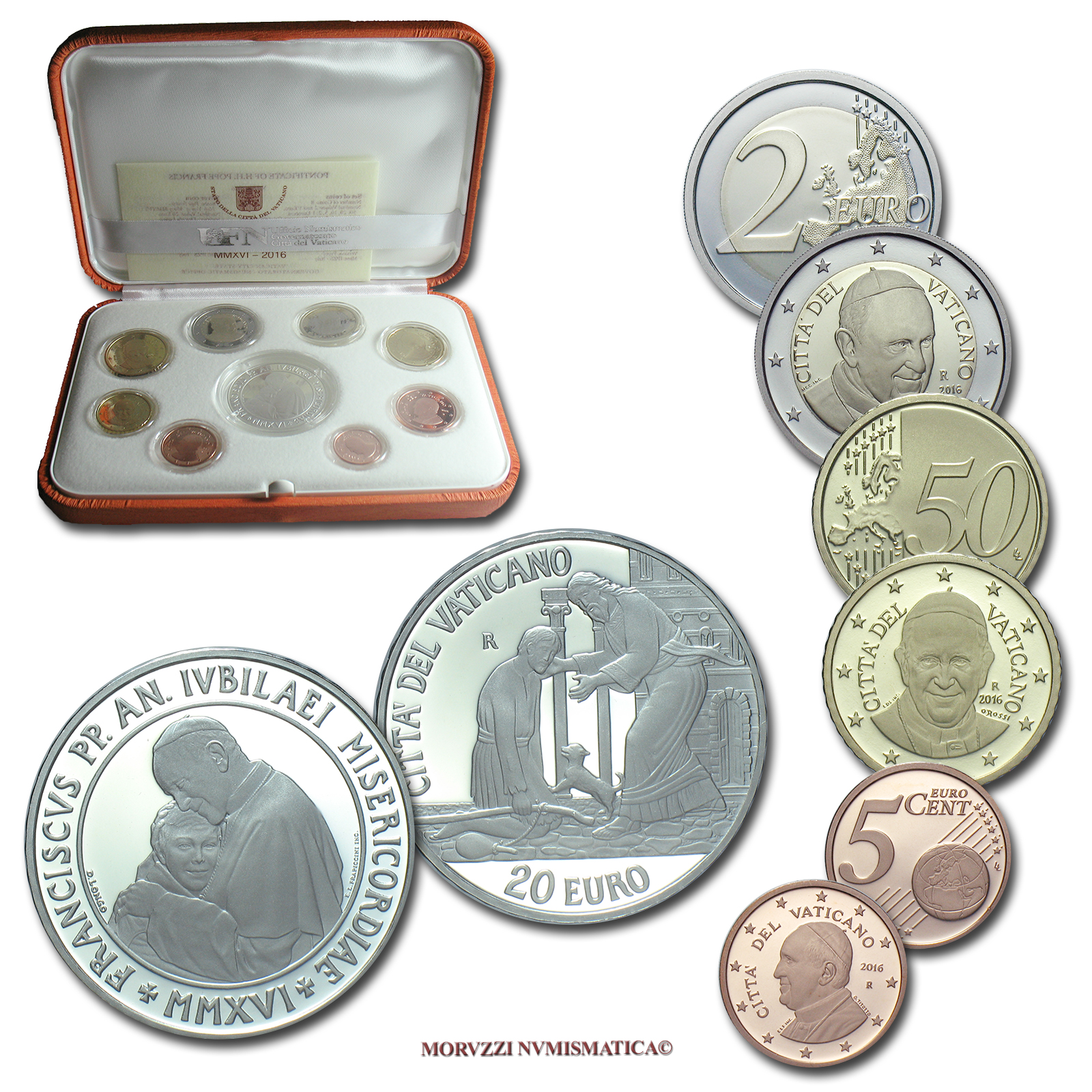 Città del Vaticano, FRANCESCO, Bergoglio, serie annuale ufficiale, 9 valori, 2016, Anno Santo della Misericordia, FS / monete vaticane d'argento