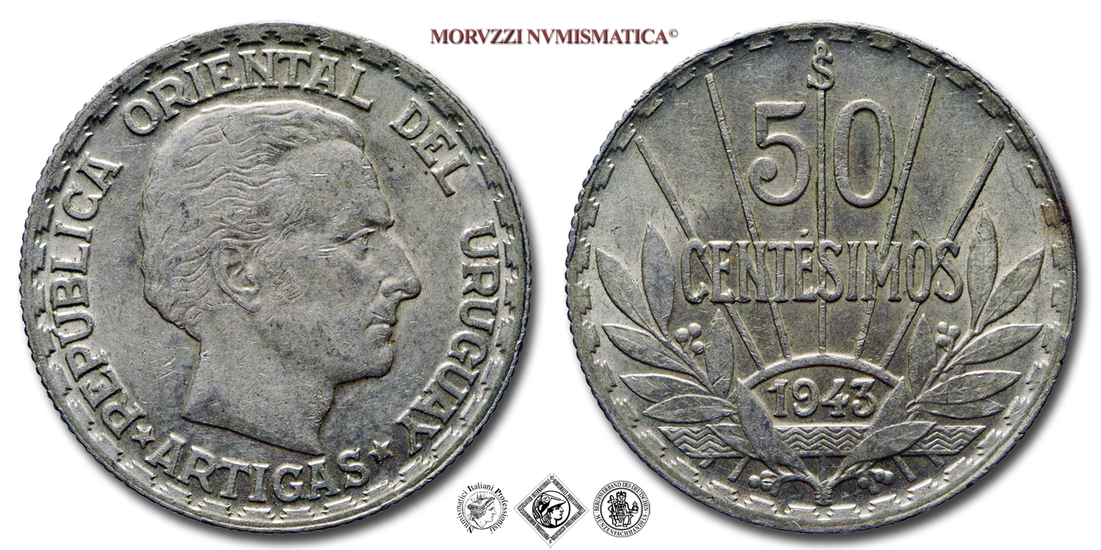Uruguay, REPUBBLICA, CENTESIMI 50, 1943, Zecca di Santiago del Cile, ARGENTO, qSPL, (KM 31) / REPÚBLICA ORIENTAL DEL URUGUAY 50 centésimos (0,50 UYP) *ARTIGAS* monedas circulantes normales de plata de la Casa de Moneda de Chile (World SILVER Coins - monete mondiali d'argento - moneta mondiale da collezione)