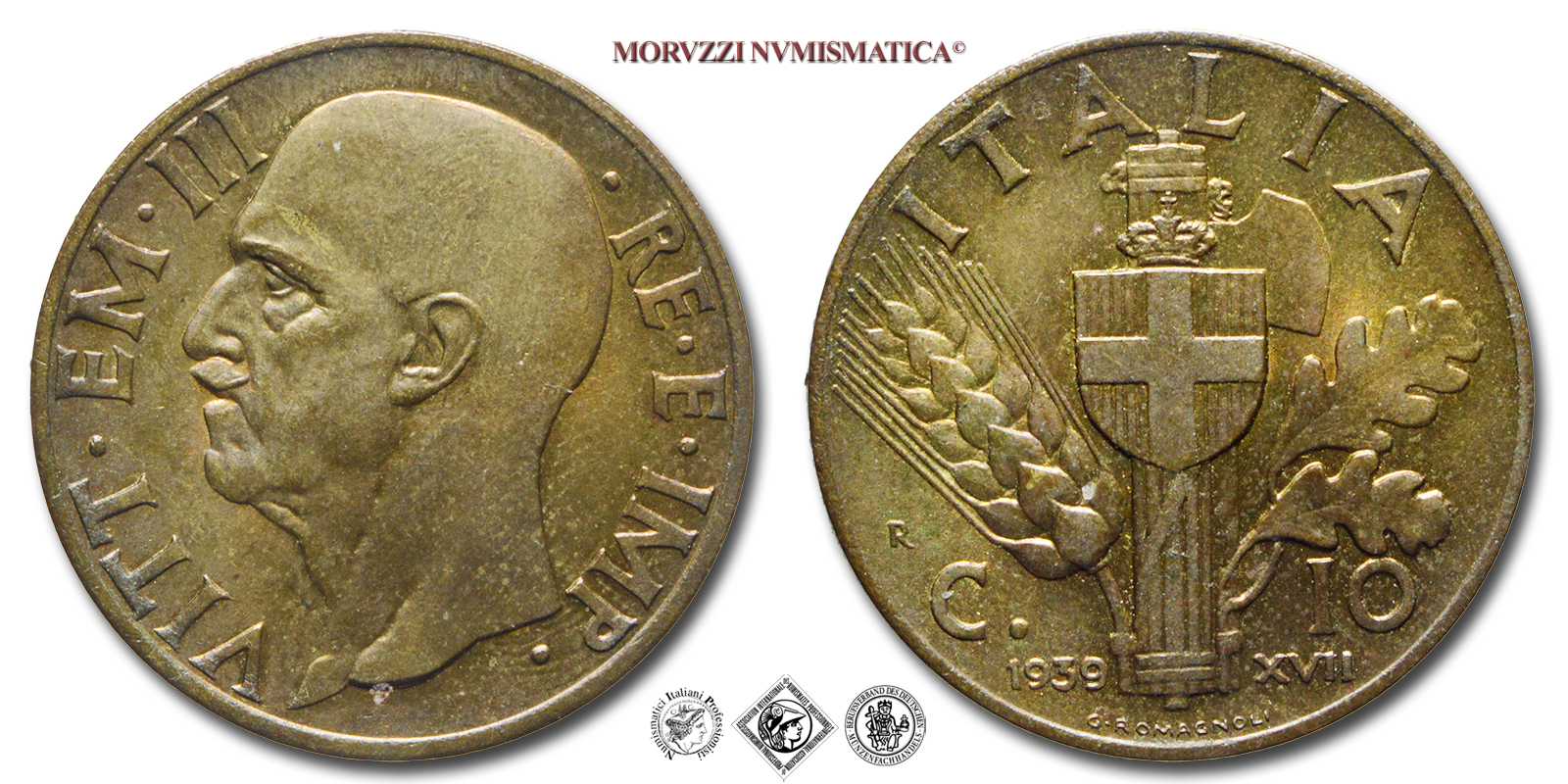 Regno d'Italia, VITTORIO EMANUELE III, CENTESIMI 10, Impero 2° tipo, 1939 XVII, Zecca di Roma, RAME, mSPL, (Pagani 887) / monete italiane moderne (moneta italiana moderna da collezione - Casa Savoia)