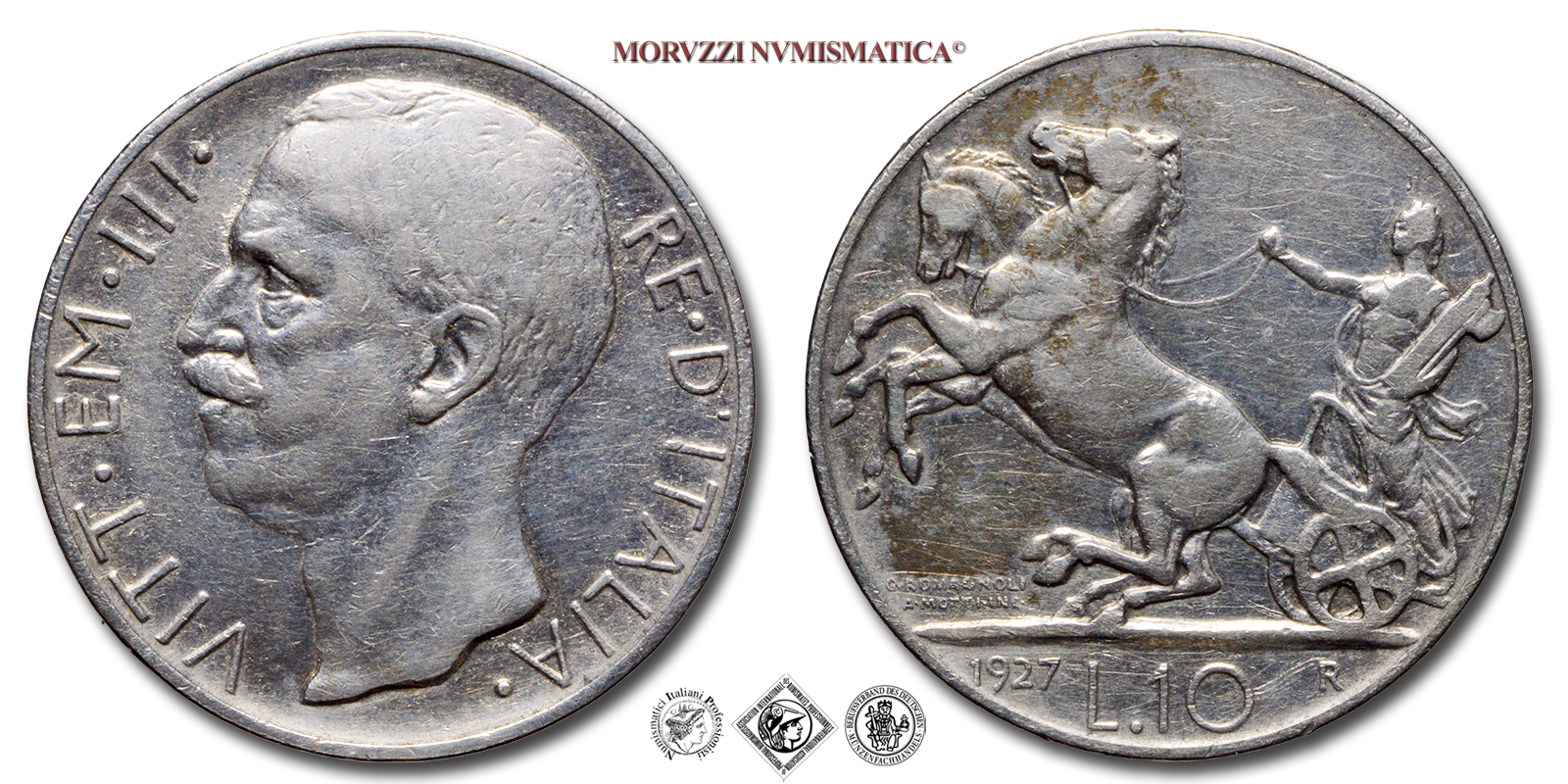 Regno d'Italia, VITTORIO EMANUELE III, LIRE 10, Biga - due rosette, 1927, Zecca di Roma, ARGENTO, BB, (Pagani 692a) / monete italiane moderne d'argento (moneta italiana moderna da collezione - Casa Savoia)