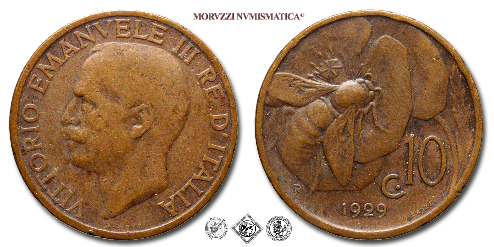 Regno d'Italia, VITTORIO EMANUELE III, CENTESIMI 10, Ape, 1929, Zecca di Roma, RAME, BB, (Pagani 866) / monete italiane moderne (moneta italiana moderna da collezione - Casa Savoia)