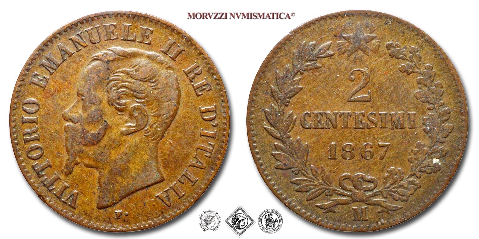 Regno d'Italia, VITTORIO EMANUELE II, CENTESIMI 2, 1867 M, Zecca di Milano, RAME, mBB, (Pagani 560) / monete italiane moderne (moneta italiana moderna - Casa Savoia)