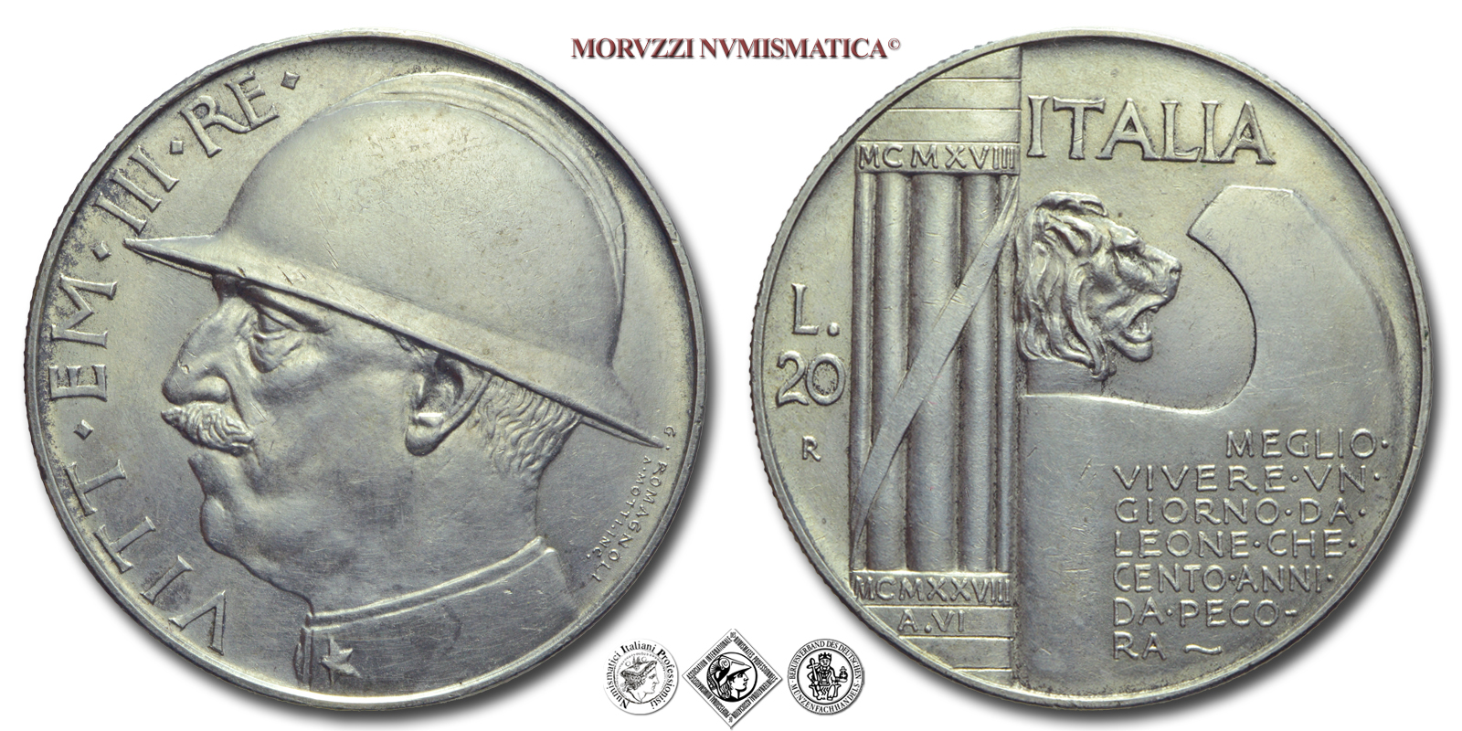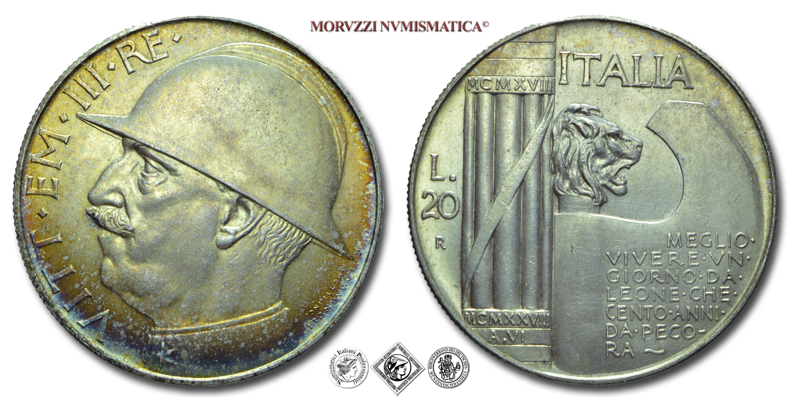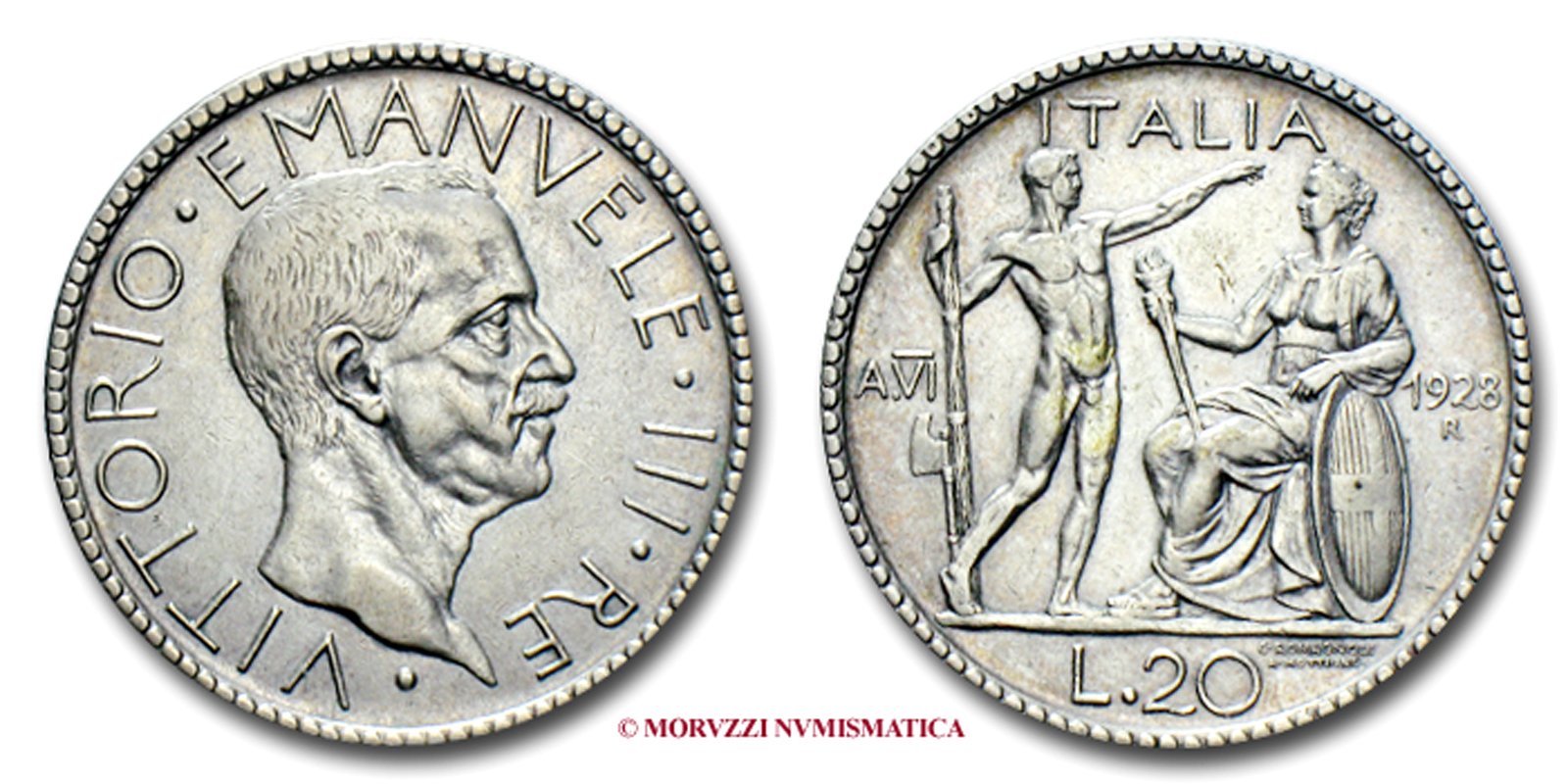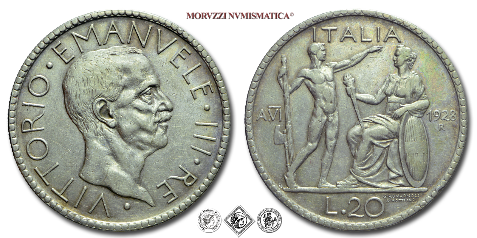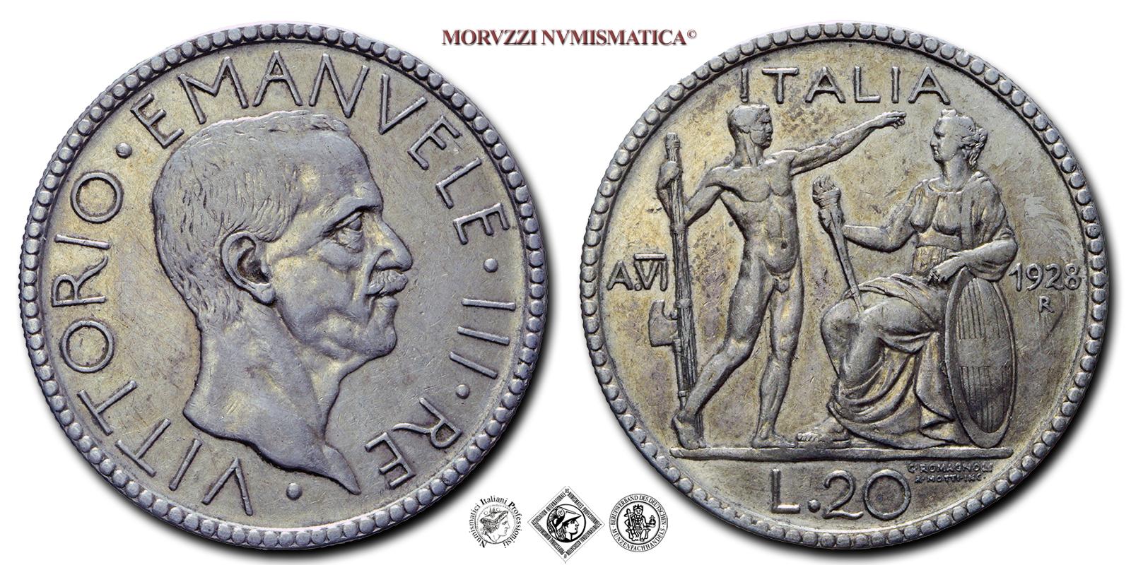 Regno d'Italia, VITTORIO EMANUELE III, 20 LIRE, 1928 A VI, Cappellone o Elmetto, Zecca di Roma, ARGENTO, qFDC, (R), (Pagani 680) / monete italiane moderne rare d'argento (moneta italiana moderna rara da collezione - Casa Savoia)