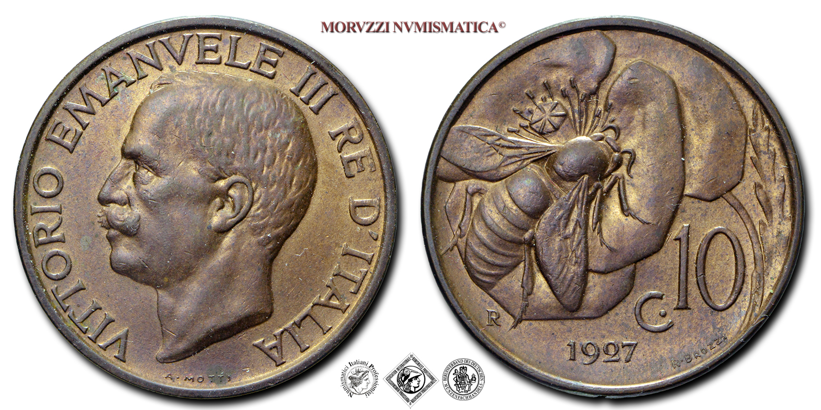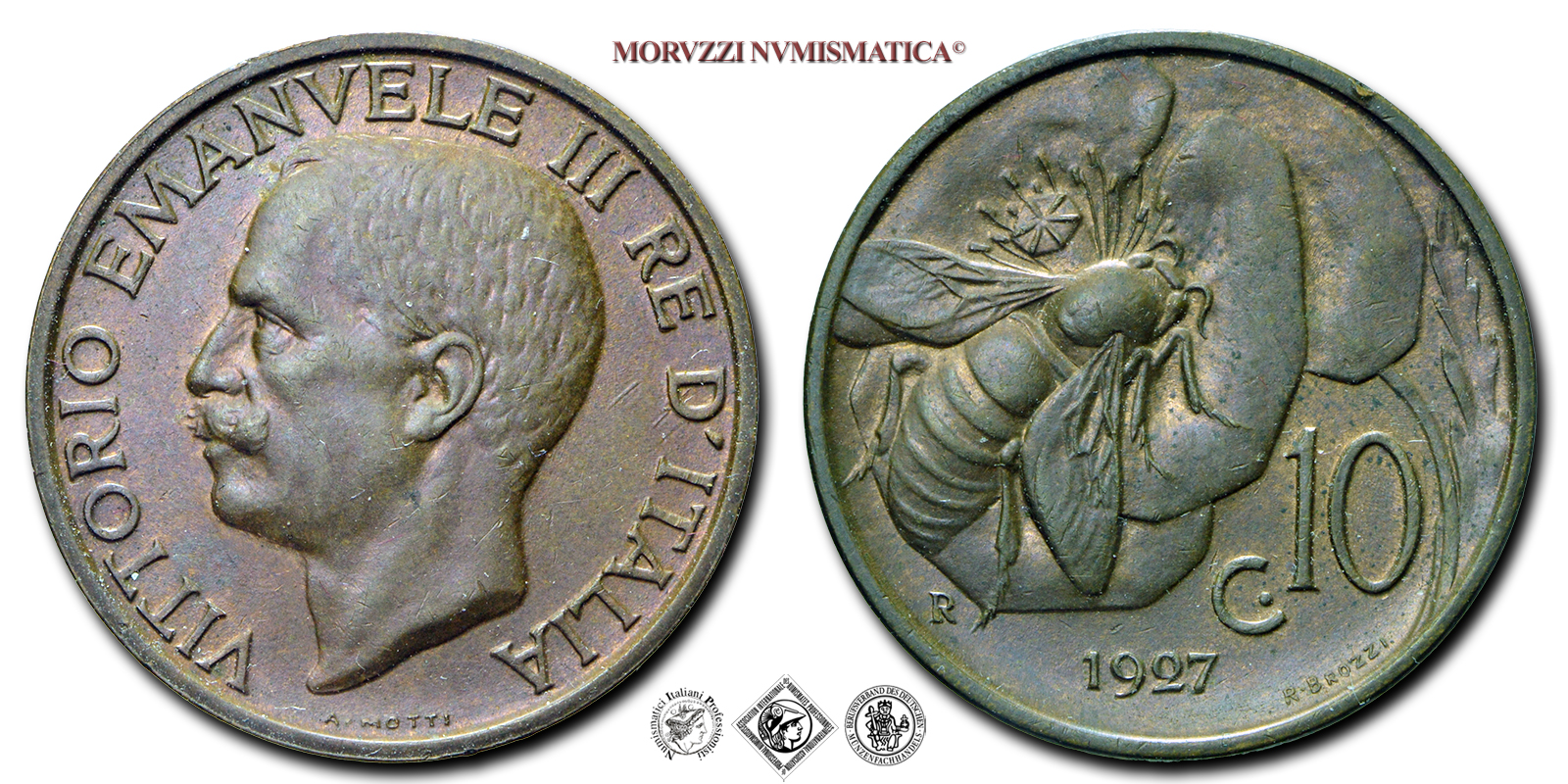Regno d'Italia, VITTORIO EMANUELE III, 10 CENTESIMI, 1927, Ape, Zecca di Roma, RAME, mSPL, (Pagani 872) / monete italiane moderne (moneta italiana moderna da collezione - Casa Savoia)