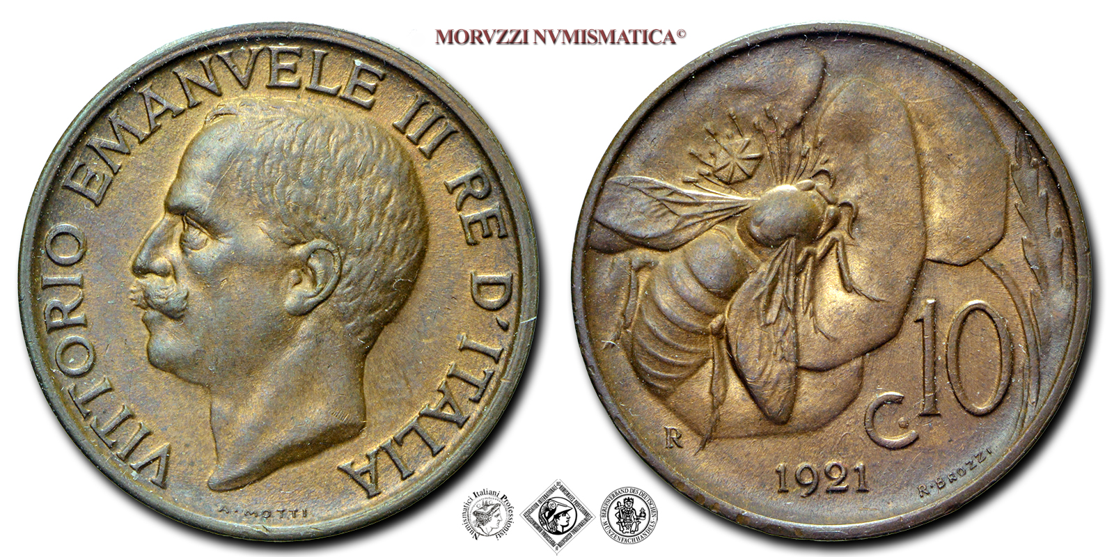 Regno d'Italia, VITTORIO EMANUELE III, 10 CENTESIMI, 1921, Ape, Zecca di Roma, RAME, FDC, (Pagani 866) / monete italiane moderne (moneta italiana moderna da collezione - Casa Savoia)