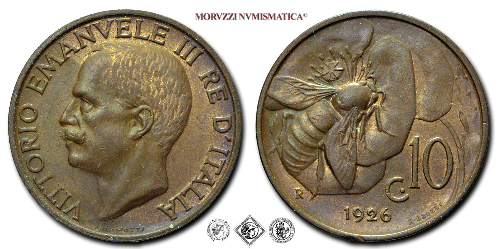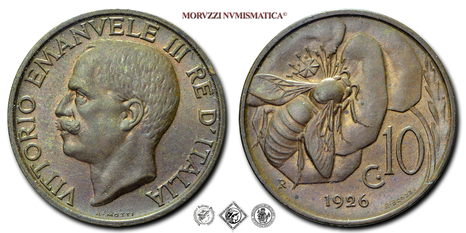 Regno d'Italia, VITTORIO EMANUELE III, 10 CENTESIMI, 1926, Ape, Zecca di Roma, RAME, qFDC, (NC), (Pagani 871) / monete italiane moderne (moneta italiana moderna da collezione - Casa Savoia)