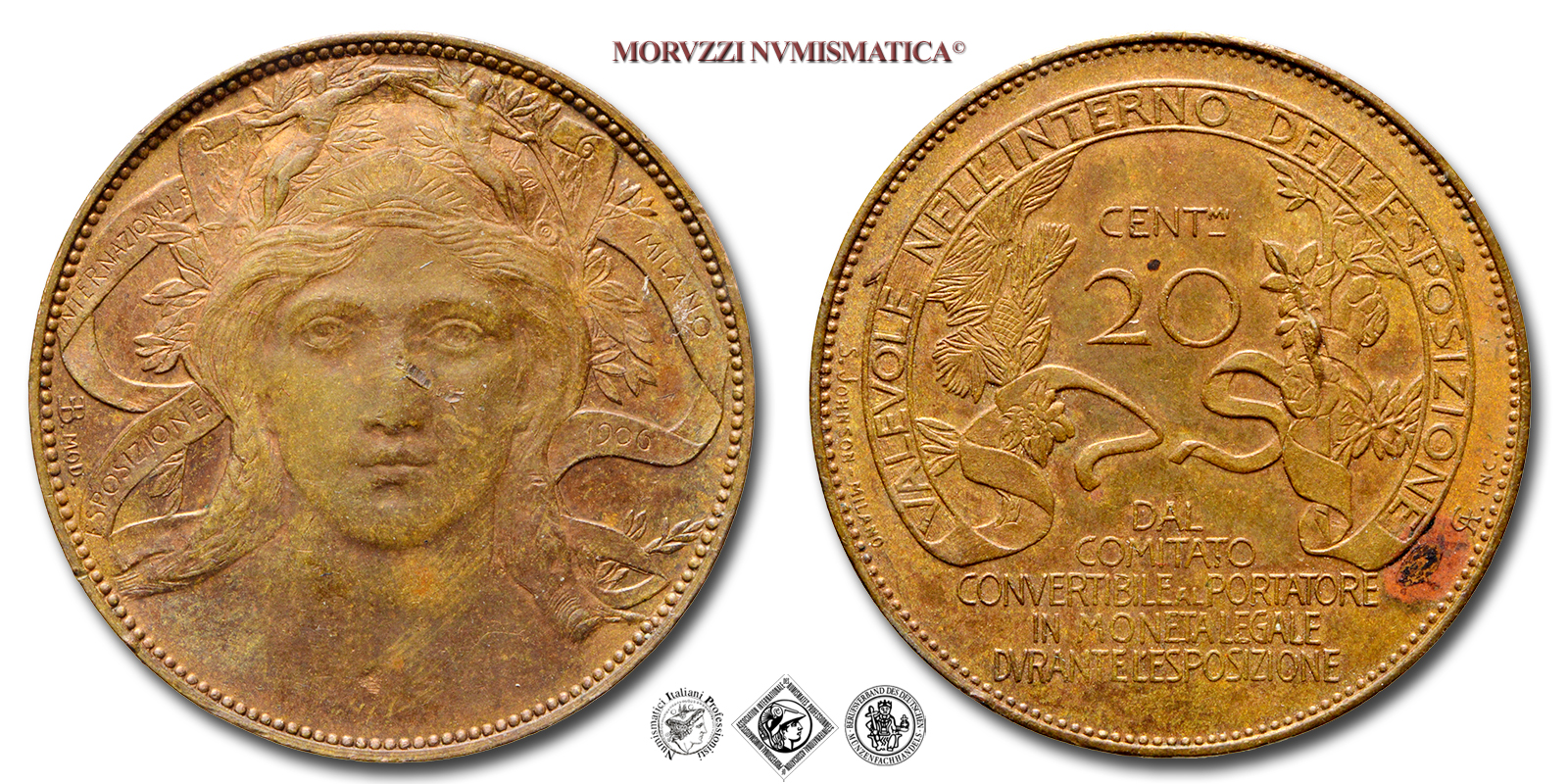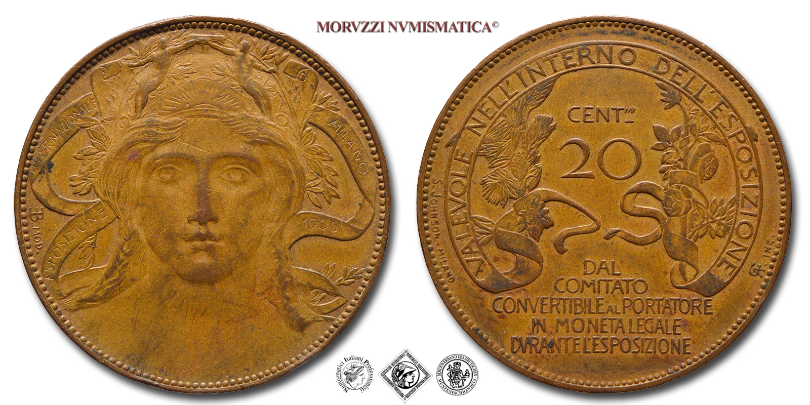 Regno d'Italia, VITTORIO EMANUELE III, CENTESIMI 20, Esposizione di Milano, 1906, Zecca di Milano, S. Johnson, RAME, SPL, (Pagani 725) / monete italiane moderne (moneta italia moderna - gettoni da collezione - Casa Savoia)