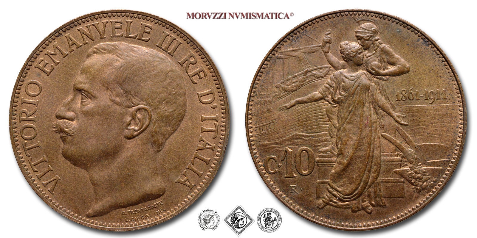 Regno d'Italia, VITTORIO EMANUELE III, CENTESIMI 10, 1911, Cinquantenario, Zecca di Roma, RAME, qFDC, (Pagani 863) / monete italiane moderne (moneta italiana moderna da collezione - Casa Savoia)