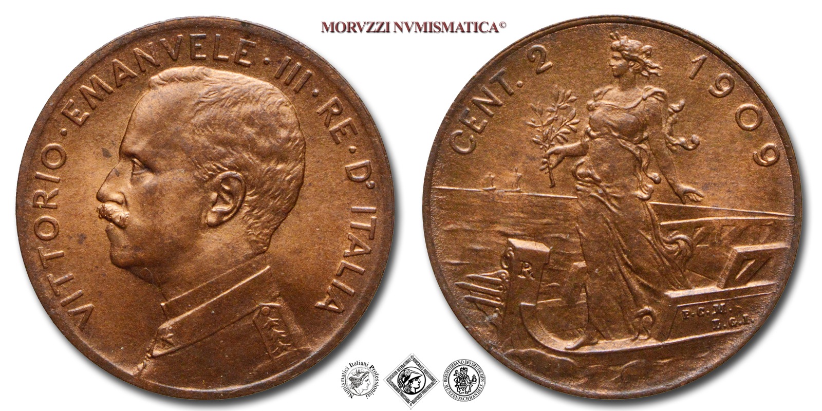 Regno d'Italia, VITTORIO EMANUELE III, CENTESIMI 2, Italia su prora, 1909, Zecca di Roma, RAME, FDC, (Pagani 932) / monete italiane moderne (moneta italiana moderna da collezione - Casa Savoia)