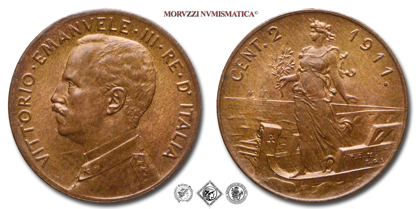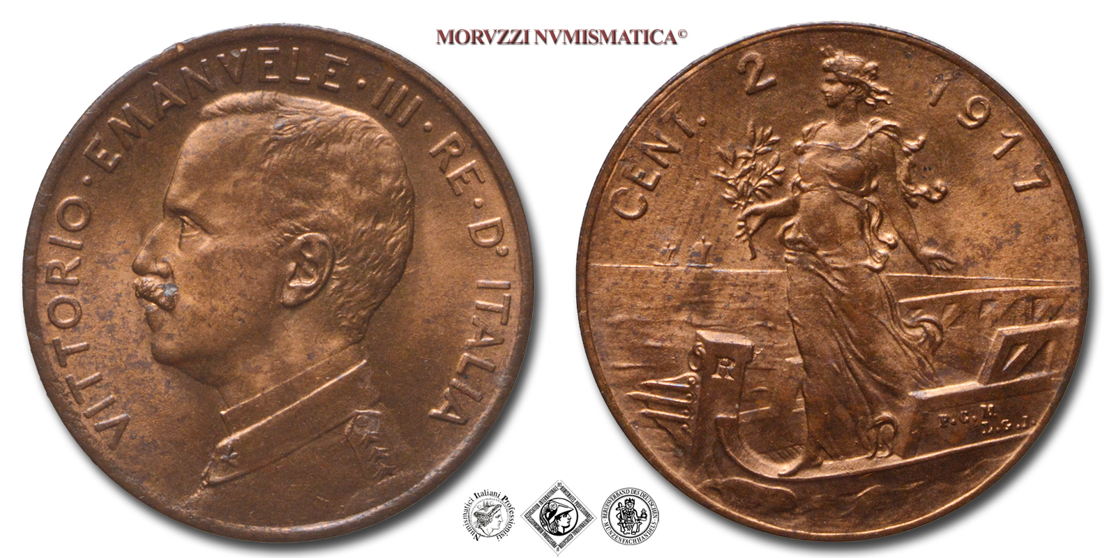 Regno d'Italia, VITTORIO EMANUELE III, CENTESIMI 2, Italia su prora, 1911, Zecca di Roma, RAME, FDC, (Pagani 934) / monete italiane moderne (moneta italiana moderna da collezione - Casa Savoia)