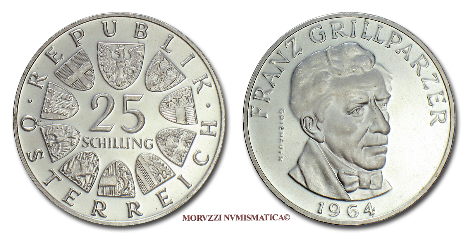Austria, REPUBBLICA, 25 SCELLINI, 1964, Franz Grillparzer, zecca di Vienna, ARGENTO, FS, (KM 2895.1) / Republik Österreich 25 SCHILLING Wien Silbermünzen PP (monete mondiali moderne commemorative - moneta commemorativa d'argento - monete europee)
