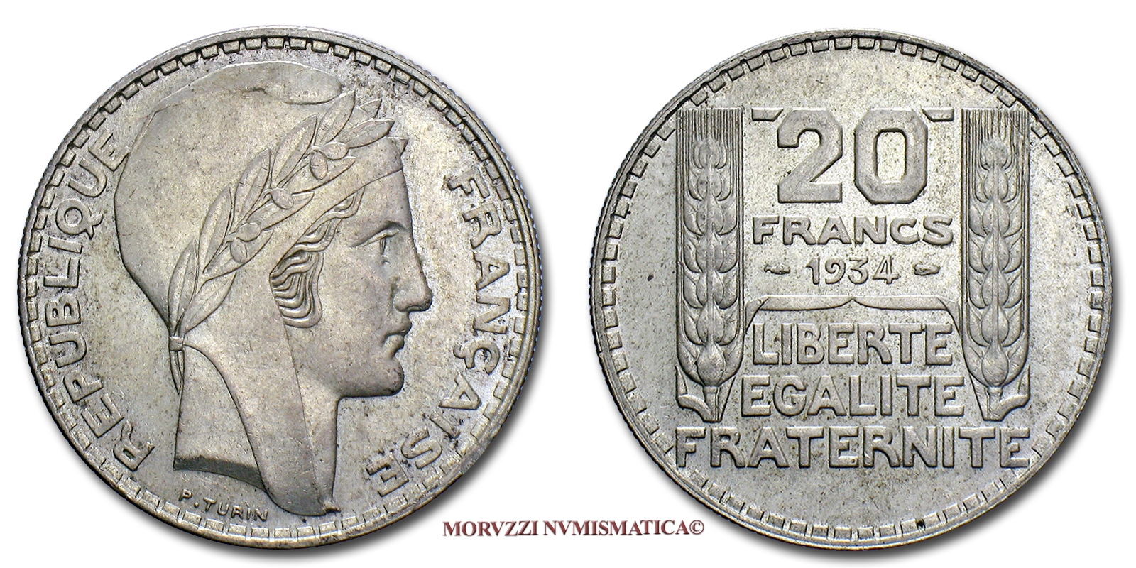 Francia, TERZA REPUBBLICA, 20 FRANCHI, 1934, Tipo Turin, Parigi, ARGENTO, qFDC, (Gadoury 852) / France 20 Francs Type Turin Paris SILVER COINS (monete francesi d'argento) - Frankreich