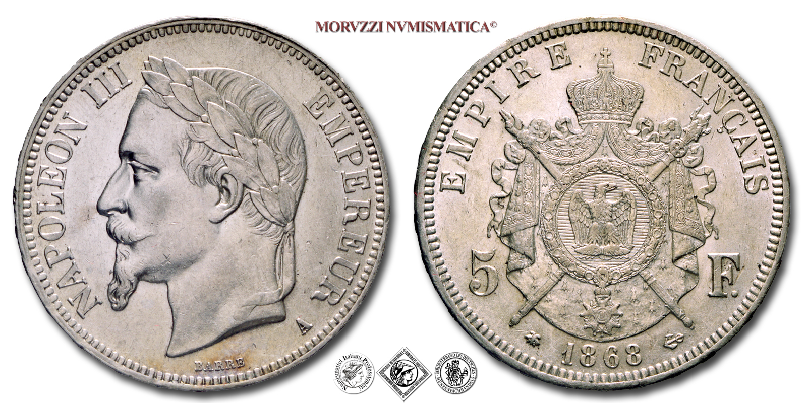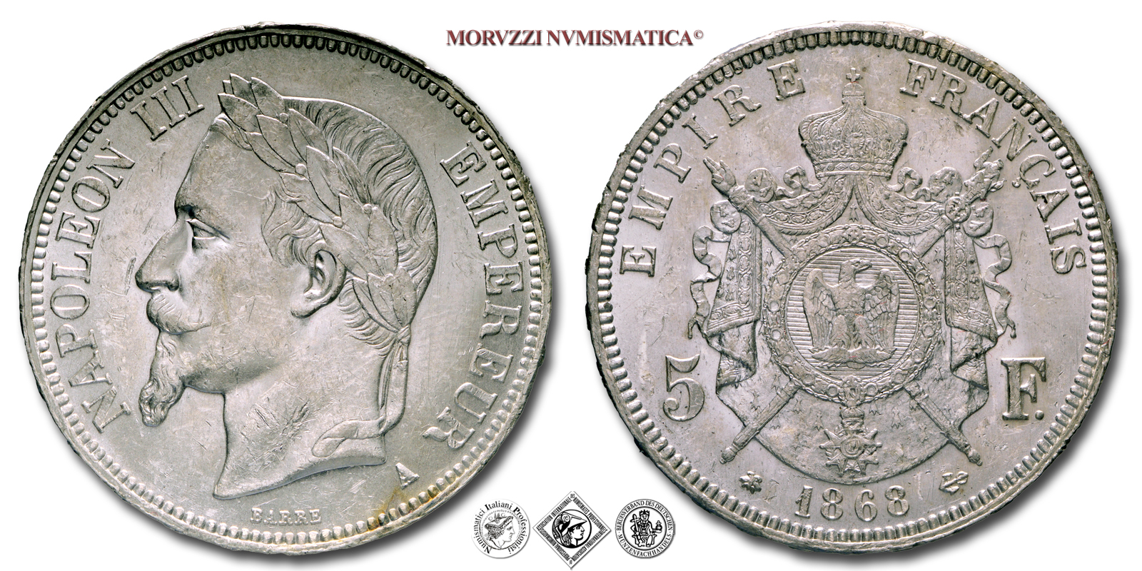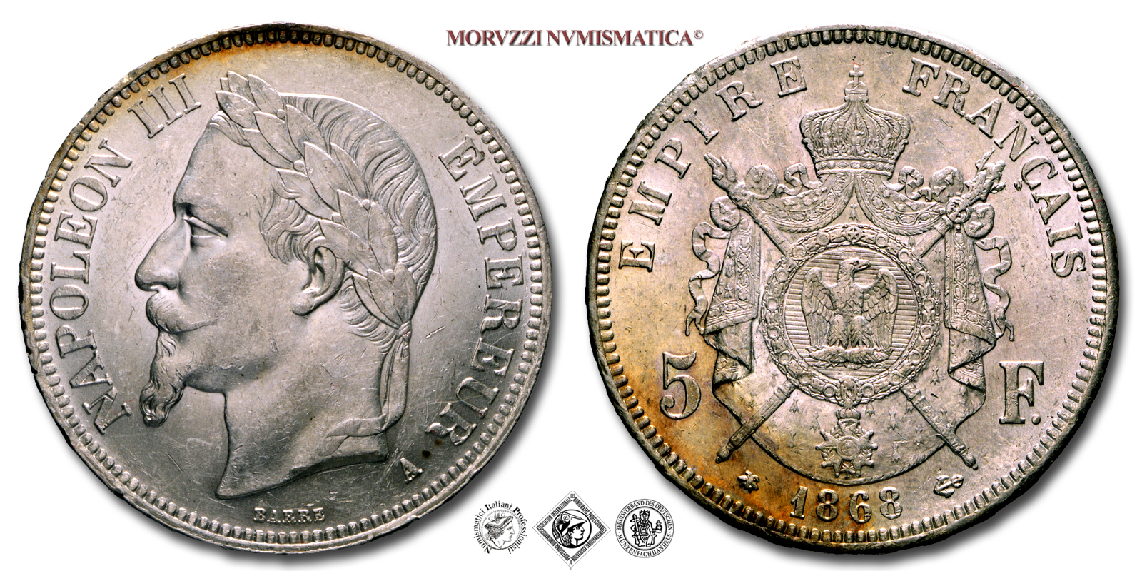 Francia, NAPOLEONE III, 5 FRANCHI, 1868 A, Zecca di Parigi, ARGENTO, FDC, (Gadoury 739) / France Napoléon III Empereur des Français 5 FRANCS Paris pièces de monnaies françaises (monete mondiali europee francesi d'argento - moneta francese)