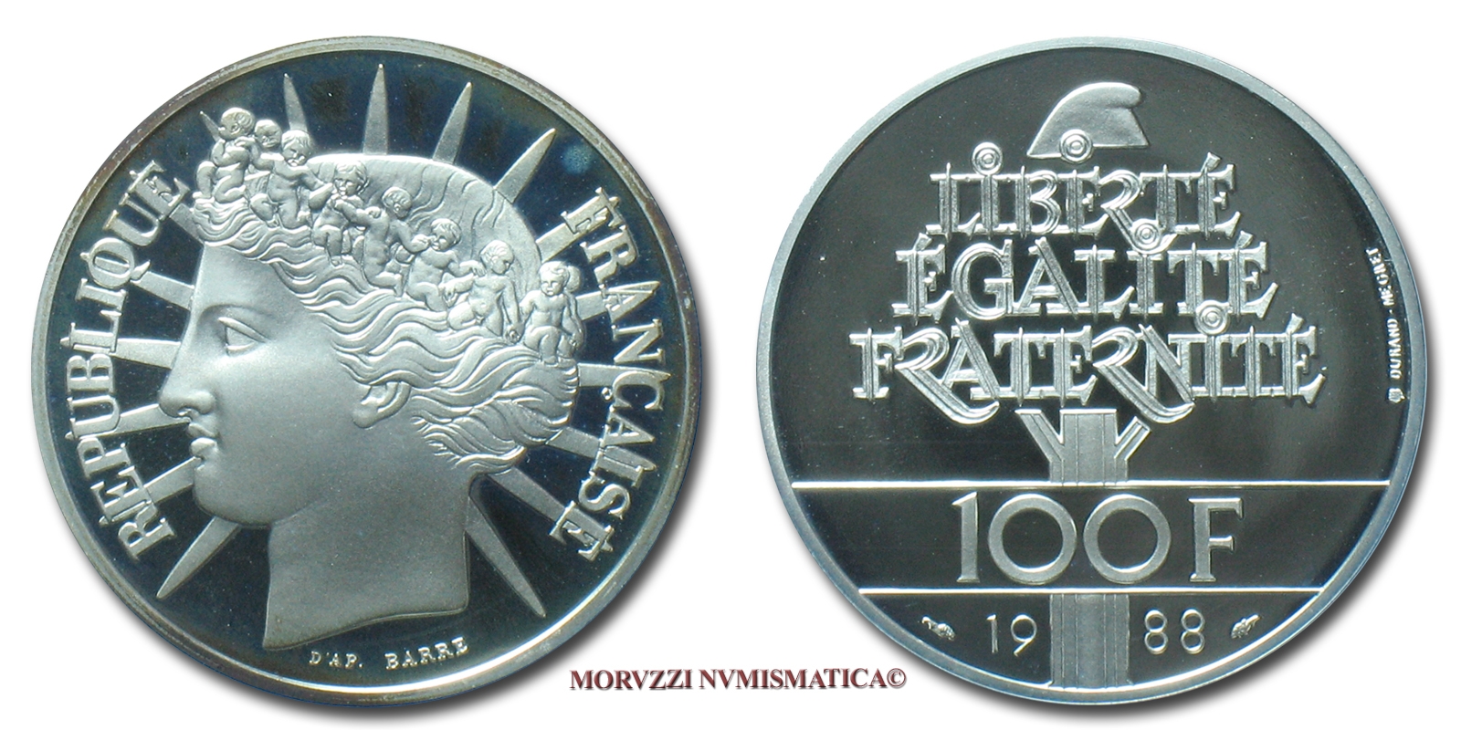 Francia, QUINTA REPUBBLICA, 100 FRANCHI, 1988, Fratellanza, zecca di Parigi, ARGENTO, FS, (Gadoury 903) / France 100 FRANCS Fraternité Paris pièces de monnaies françaises (WORLD SILVER COINS - monete francesi d'argento - moneta francese)
