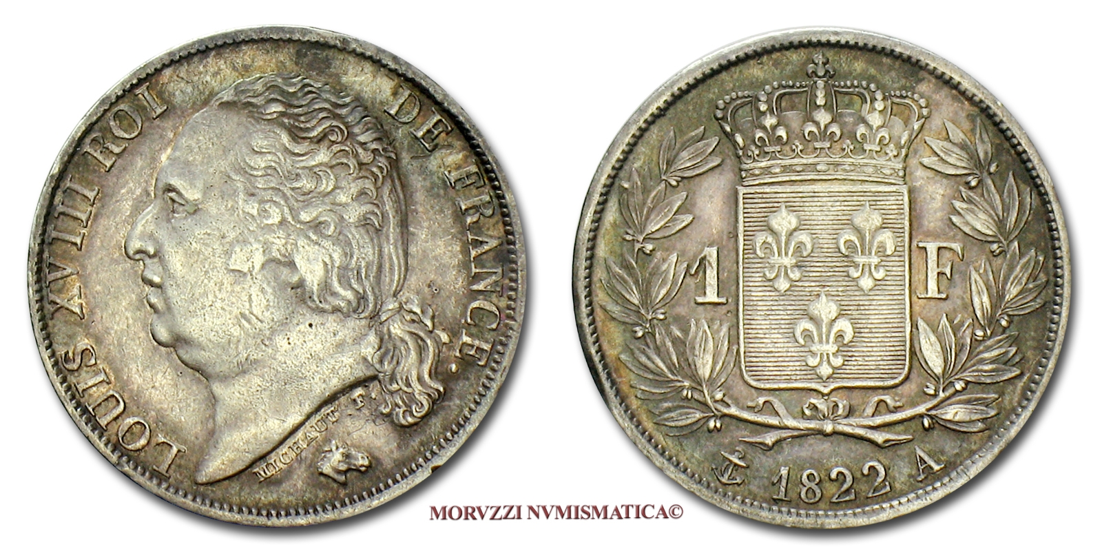 Francia, LUIGI XVIII, FRANCO, 1822 A, zecca di Parigi, ARGENTO, mBB, (Gadoury 449) / Louis XVIII Roi de France et de Navarre 1 FRANC Paris pièces de monnaies françaises royales (monete francesi d'argento - monete mondiali moderne - moneta da collezione)