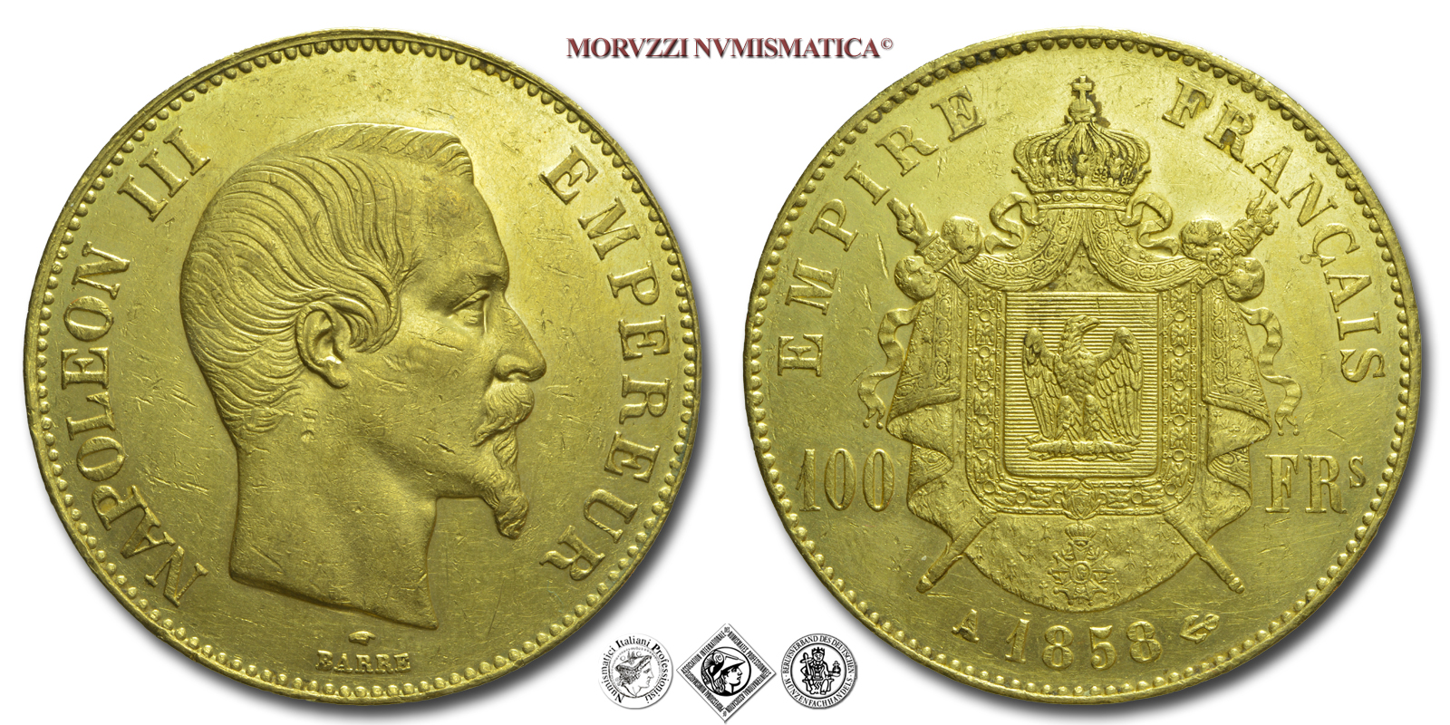 Francia, Secondo Impero, NAPOLEONE III, 100 FRANCHI, 1858 A, Zecca di Parigi, ORO, qFDC, (Gadoury 1135) / France EMPIRE FRANÇAIS NAPOLEON III EMPEREUR 100 FRANCS Paris pièces de monnaies françaises (monete francesi d'oro - moneta francese da collezione)