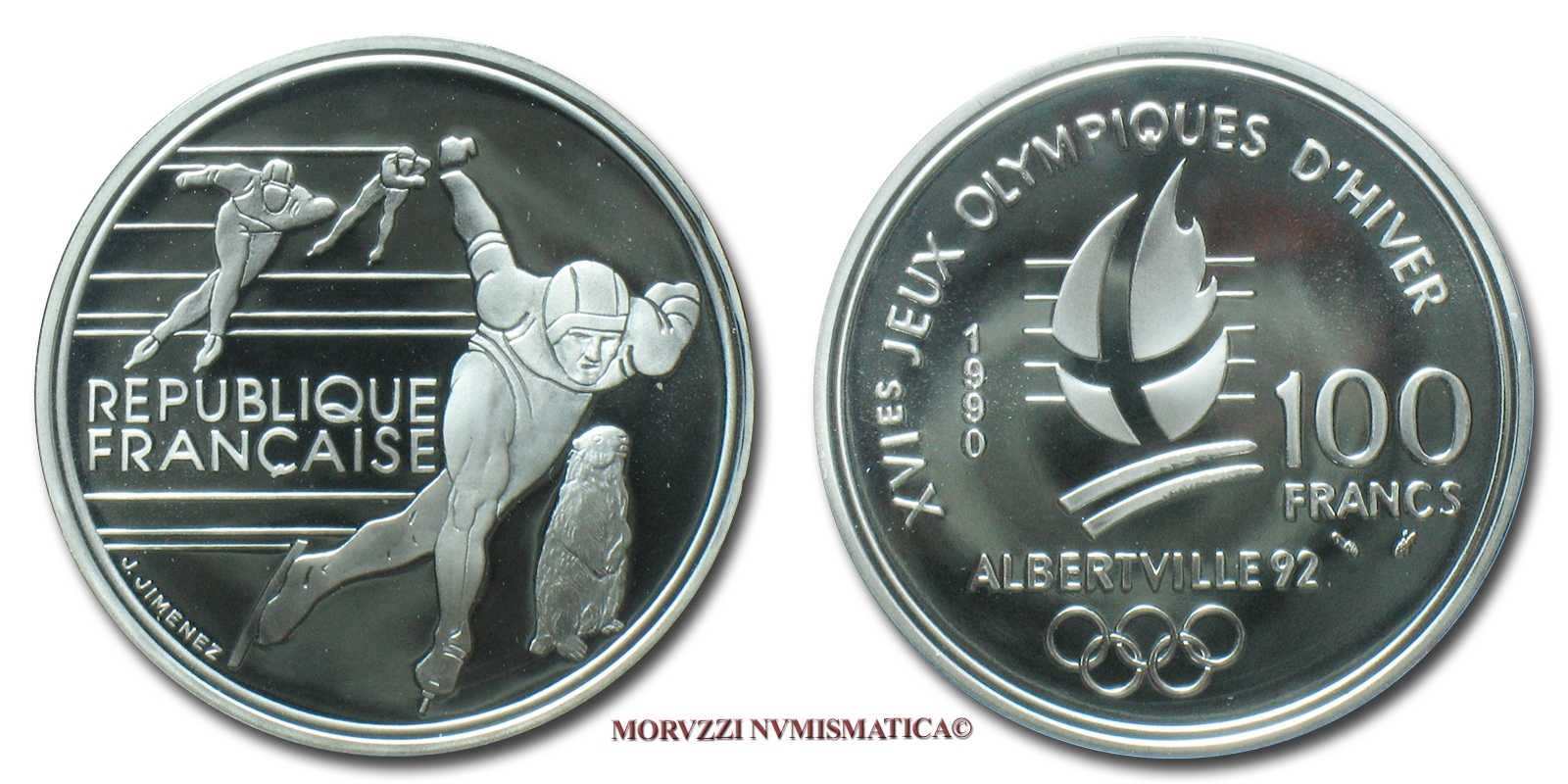 Francia, QUINTA REPUBBLICA, 100 FRANCHI, 1990, XVI Giochi Olimpici Invernali - Albertville '92, Pattinaggio di velocità, zecca di Parigi, ARGENTO, FS, (KM 980) / France 100 FRANCS XVIes JEUX OLYMPIQUES D'HIVER pièces de monnaies françaises (monete)