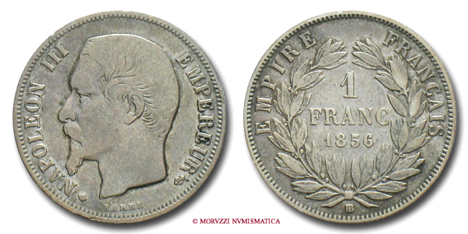 Francia, NAPOLEONE III, FRANCO, 1856 BB, zecca di Strasburgo, ARGENTO, qBB, (R), (Gadoury 460) France Napoléon III Empereur des Français FRANC Strasbourg pièces de monnaies françaises (monete mondiali europee francesi d'argento - moneta europea francese)