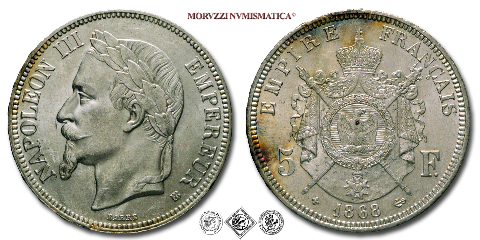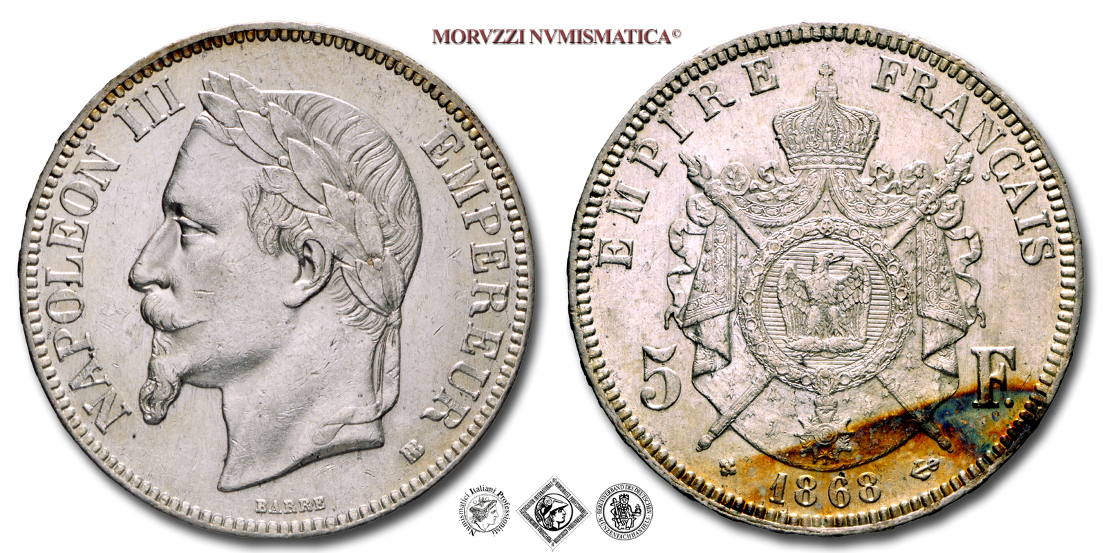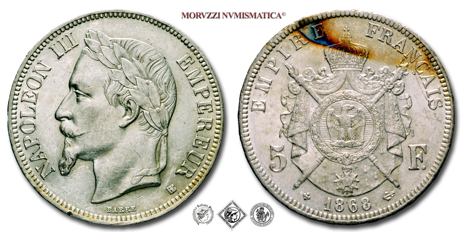 Francia, NAPOLEONE III, 5 FRANCHI, 1868 BB, Zecca di Strasburgo, ARGENTO, mSPL, (Gadoury 739) / France Napoléon III Empereur des Français 5 FRANCS Strasbourg pièces de monnaies françaises (monete mondiali europee francesi d'argento - moneta francese)