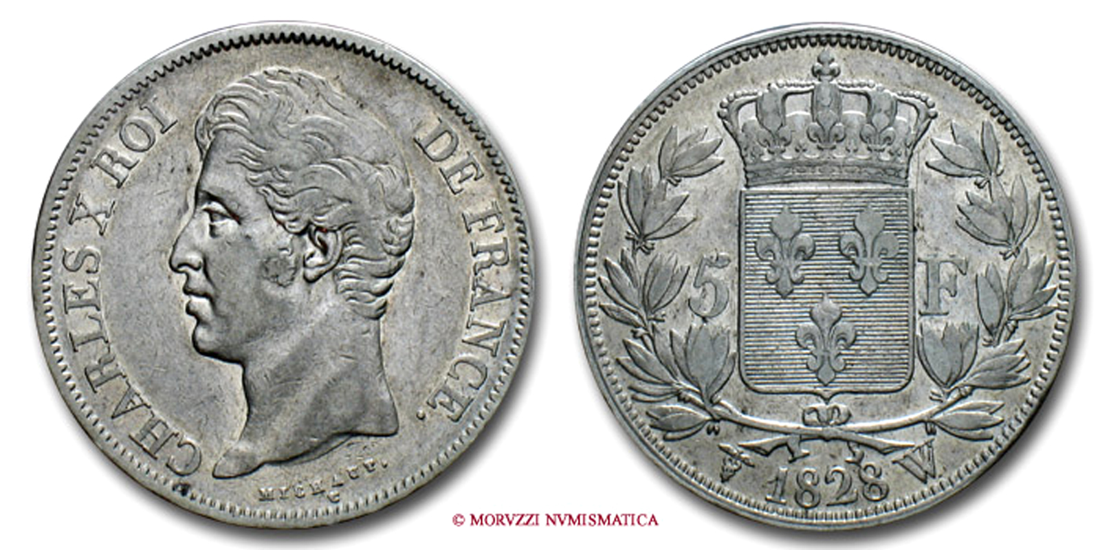Francia, CARLO X, 5 FRANCHI, 1828 W, 2° tipo, zecca di Lille, ARGENTO, mBB, (Gadoury 644) / Charles X Roi de France et de Navarre 5 FRANCS pièces de monnaies françaises (monete mondiali europee francesi d'argento - moneta mondiale europea francese)