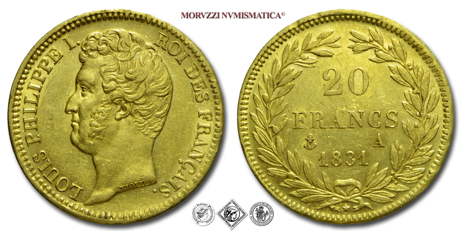 Francia, LUIGI FILIPPO I, 20 FRANCHI (MARENGO), 1831 A, Zecca di Parigi, ORO, qFDC, (Gadoury 1030) / France Louis-Philippe Ier Roi des Français 20 FRANCS Paris pièces de monnaies françaises royales (monete francesi d'oro - moneta francese - marenghi)