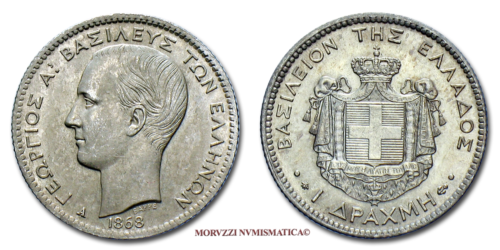 Grecia, GIORGIO I, DRACMA, 1868 A, zecca di Parigi, ARGENTO, qFDC, (KM 38) / George I of Greece King of the Hellenes DRACHMA WORLD SILVER COINS (monete europee greche moderne - moneta greca moderna d'argento) ΓΕΩΡΓΙΟΣ Α! ΒΑΣΙΛΕΥΣ ΤΩΝ ΕΛΛΗΝΩΝ - 1 ΔΡΑΧΜΗ