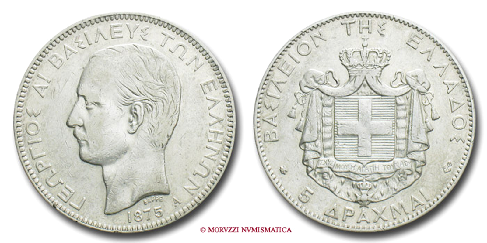 Grecia, GIORGIO I, DRACME 5, 1875 A, Zecca di Parigi, ARGENTO, mBB, (KM 46) / George I of Greece King of the Hellenes 5 Drachmai WORLD SILVER COINS (monete mondiali europee greche moderne - moneta europea greca moderna d'argento) ΓΕΩΡΓΙΟΣ Α! - 5 ΔΡΑΧΜΑΙ