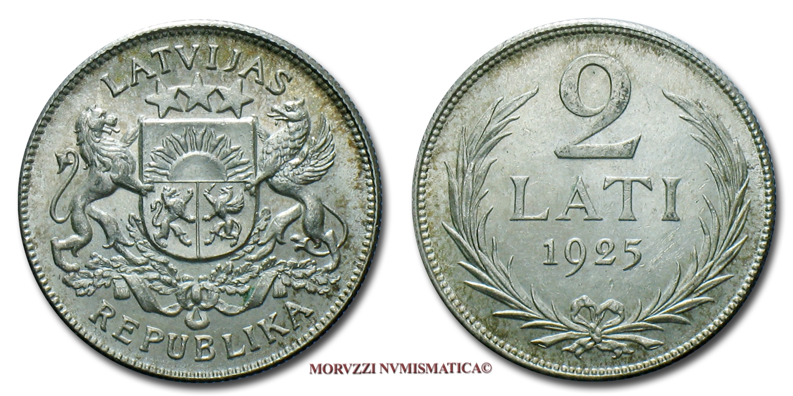 Lettonia, REPUBBLICA, 2 LATI, 1925, LATVIJAS REPUBLIKA, zecca di Londra, ARGENTO, mSPL, (KM 8) / monete mondiali europee moderne d'argento (WORLD SILVER COINS - moneta mondiale europea moderna da collezione)