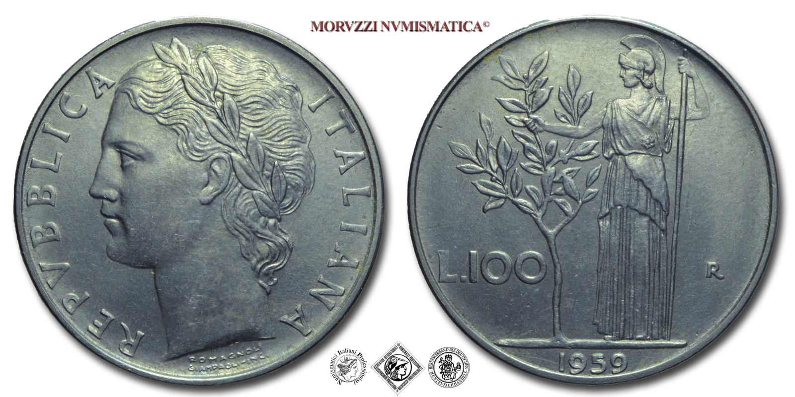 Repubblica Italiana, 100 LIRE, 1959, Minerva, Zecca di Roma, ACMONITAL, FDC, (Pagani 2155) / monete italiane moderne (moneta italiana moderna da collezione)