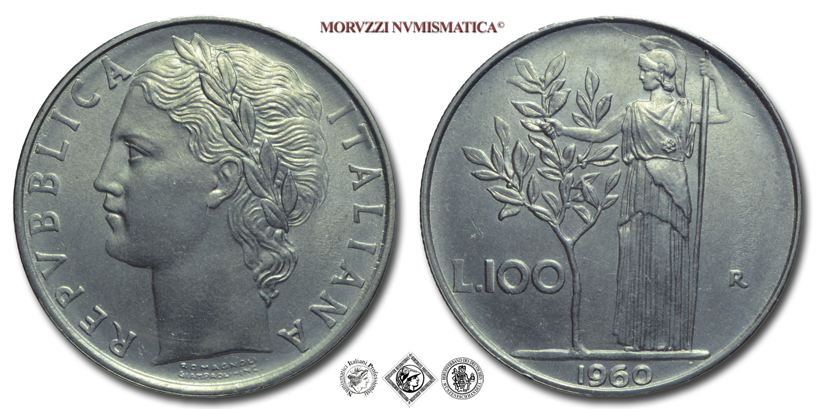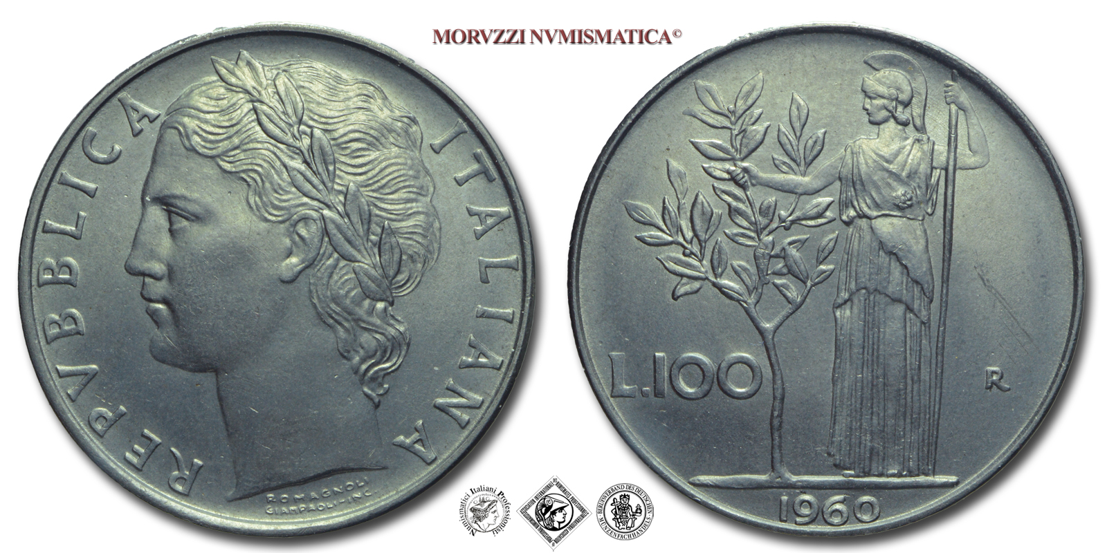 Repubblica Italiana, 100 LIRE, 1960, Minerva, Zecca di Roma, ACMONITAL, FDC, (Pagani 2156) / monete italiane moderne (moneta italiana moderna da collezione)