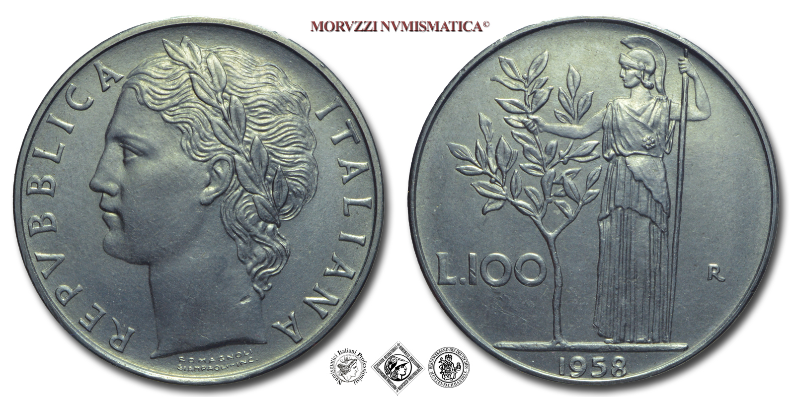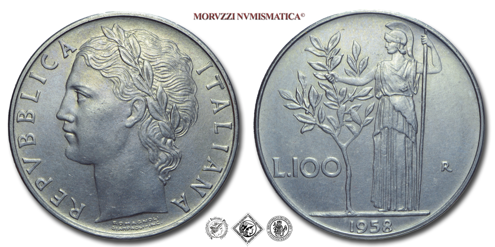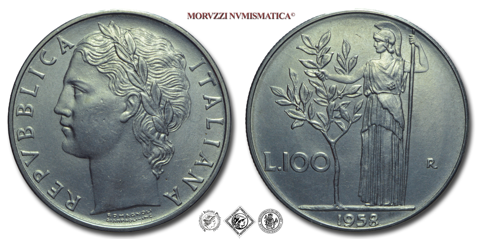 Repubblica Italiana, 100 LIRE, 1958, Minerva, Zecca di Roma, ACMONITAL, FDC, (Pagani 2154) / monete italiane moderne (moneta italiana moderna da collezione)