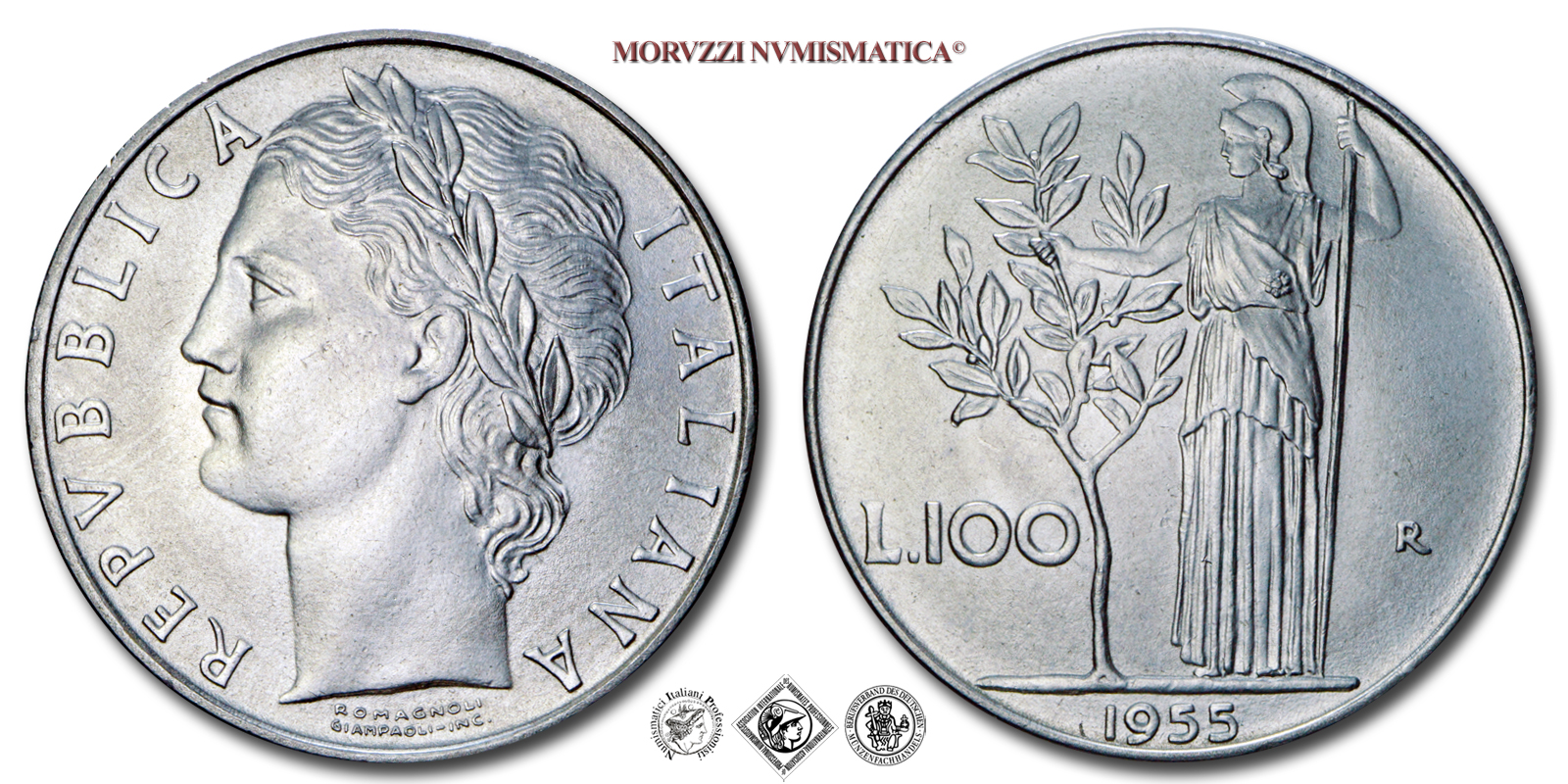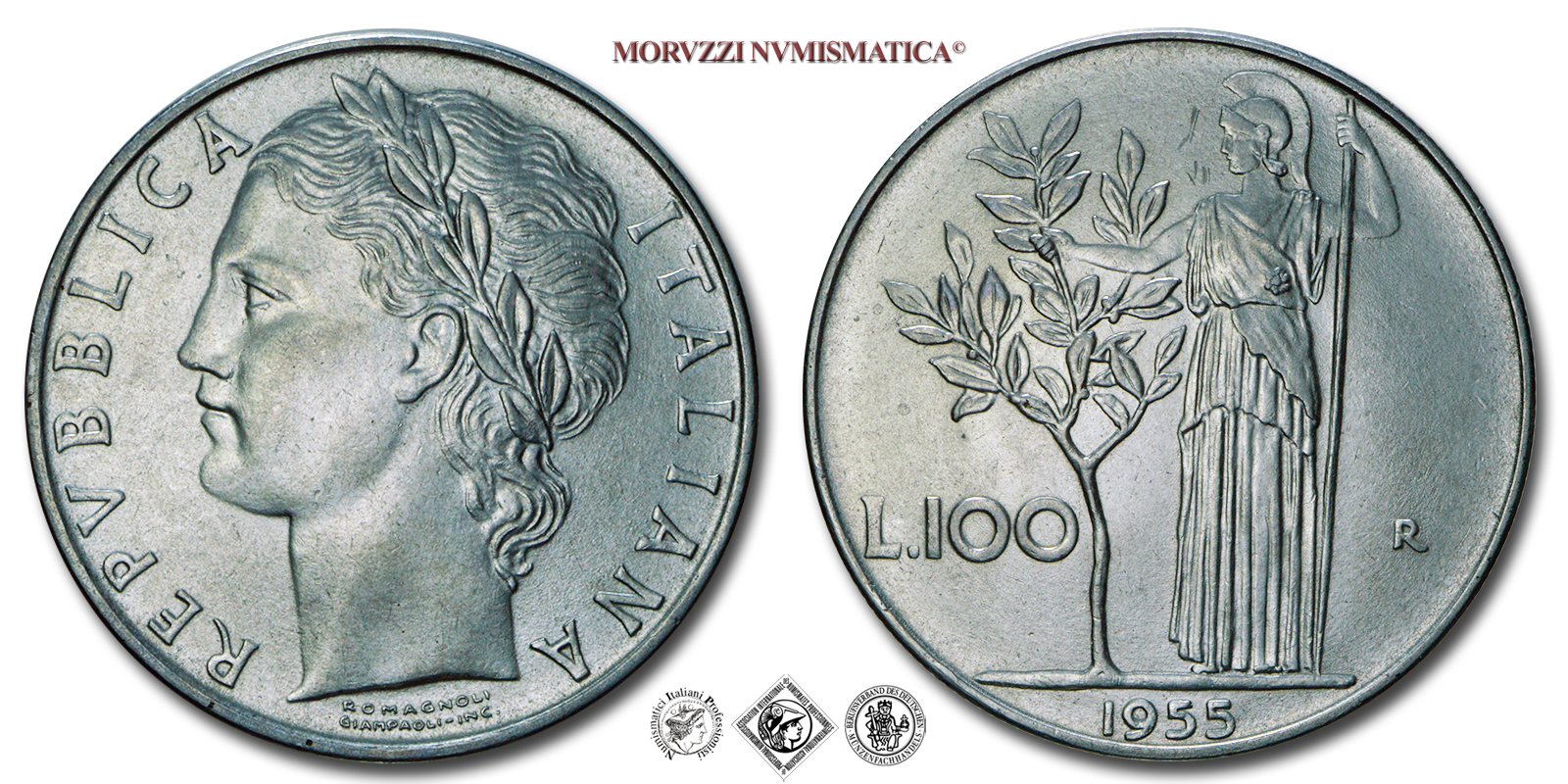 Repubblica Italiana, 100 LIRE, 1955, Minerva, Zecca di Roma, ACMONITAL, qFDC, (Pagani 2151) / monete italiane moderne (moneta italiana moderna da collezione)