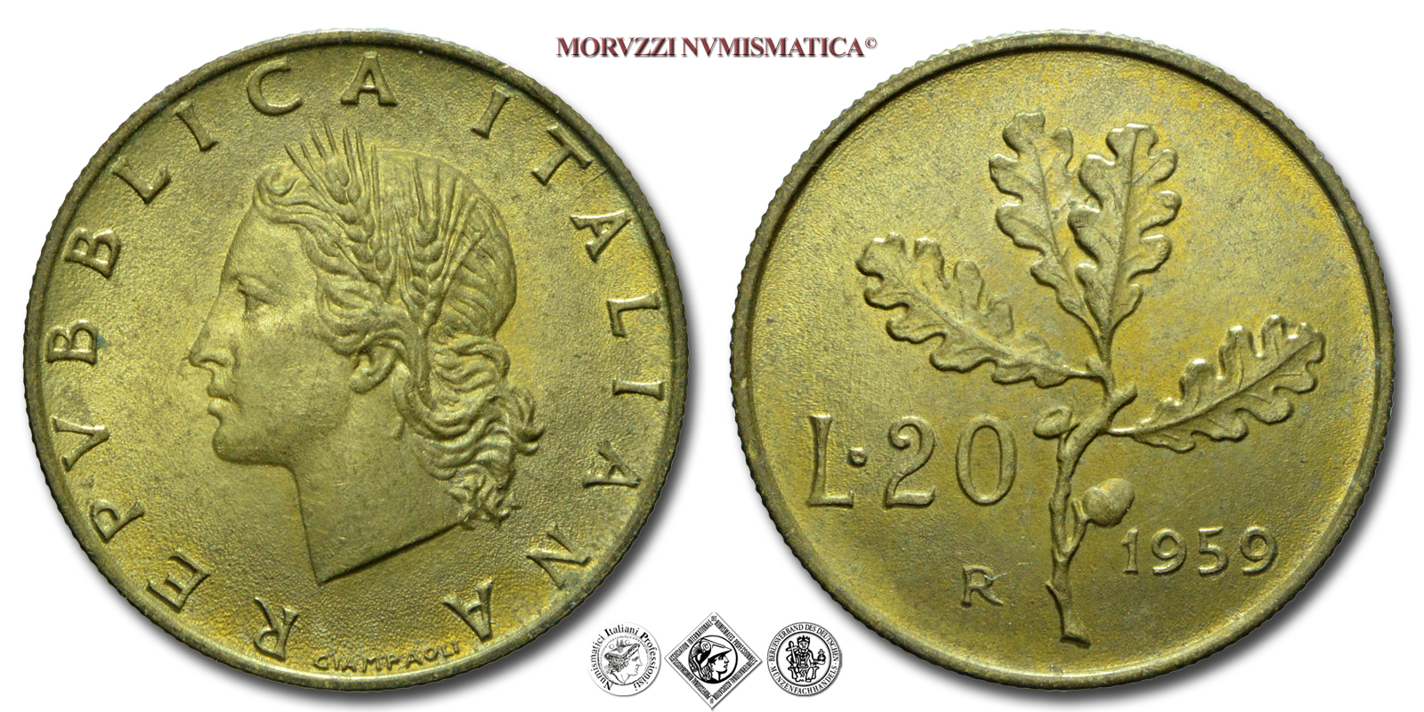 Repubblica Italiana, LIRE 20, Ramo di quercia, 1959, Zecca di Roma, BRONZITAL, FDC, (Pagani 2253) / monete italiane moderne (moneta italiana moderna da collezione)