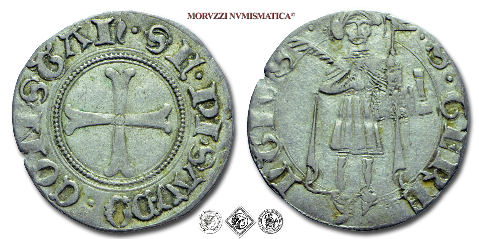 Pesaro, COSTANZO I SFORZA, TERZO DI GROSSO, 1473-1483, • S • TERENTIVS • S. Terenzio con una palma e la città di Pesaro, Zecca di Pesaro, ARGENTO, mBB, (R), (Cavicchi 28) / monete italiane medievali rare d'argento (moneta italiana medievale rara)