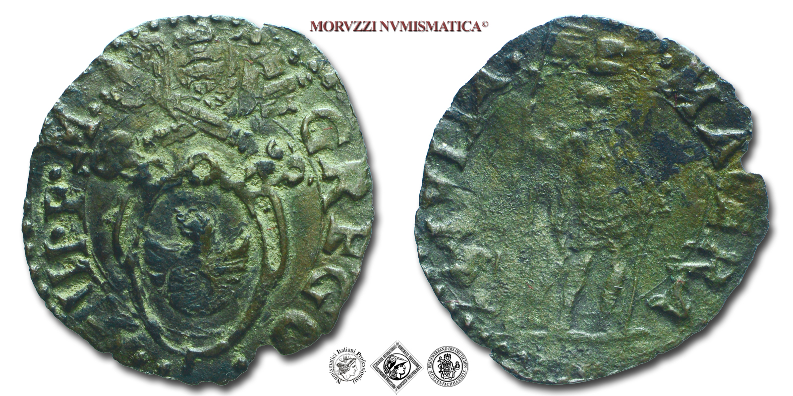 Stato Pontificio, GREGORIO XIII, Boncompagni, QUATTRINO IN MISTURA, 1575, • S • IVLIA MACER San Giuliano con vessillo, Zecca di Macerata, BB, (R), (Muntoni 447) / monete papali rare (monete pontificie da collezione - moneta papale rara)