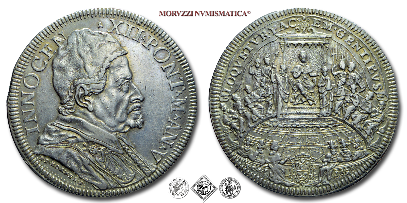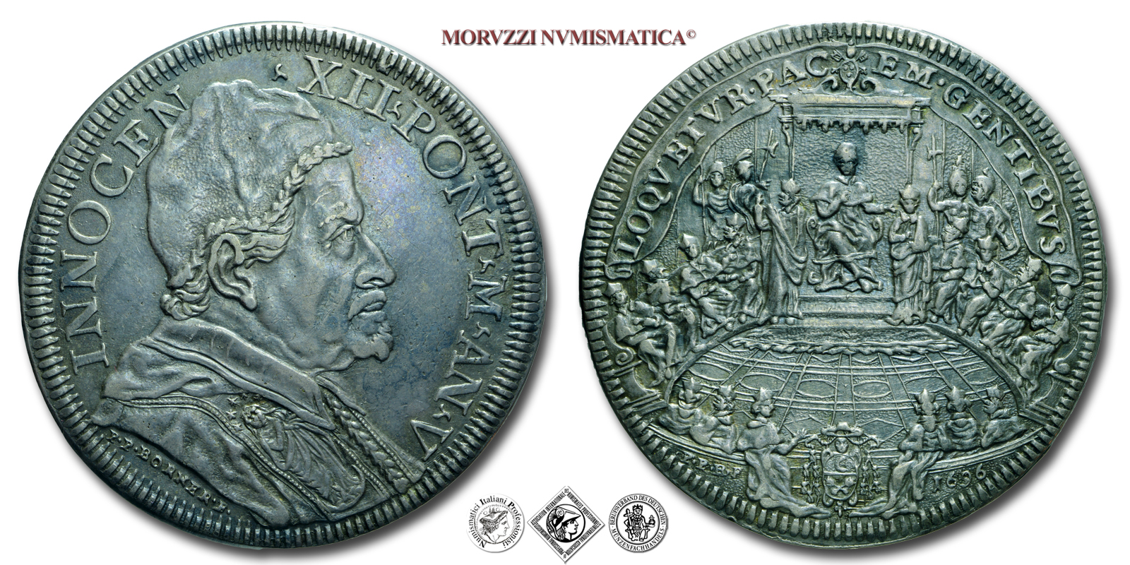 Stato Pontificio, INNOCENZO XII, Pignatelli, PIASTRA, 1696 AN V, LOQVETVR • PACEM • GENTIBVS Il papa in concistoro, Zecca di Roma, ARGENTO, qSPL, (R), (Muntoni 20) / monete papali rare da collezione (piastre pontificie d'argento)
