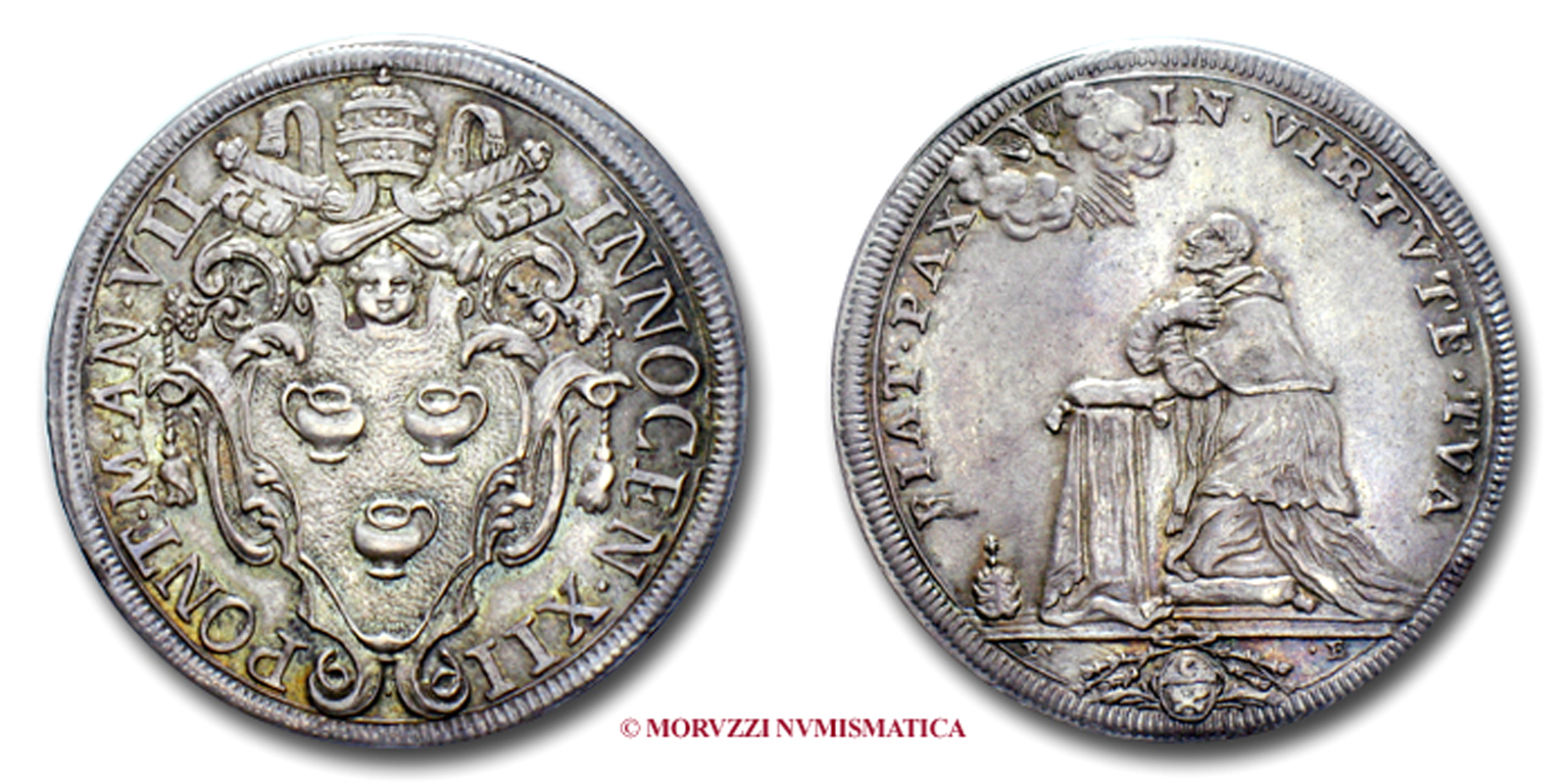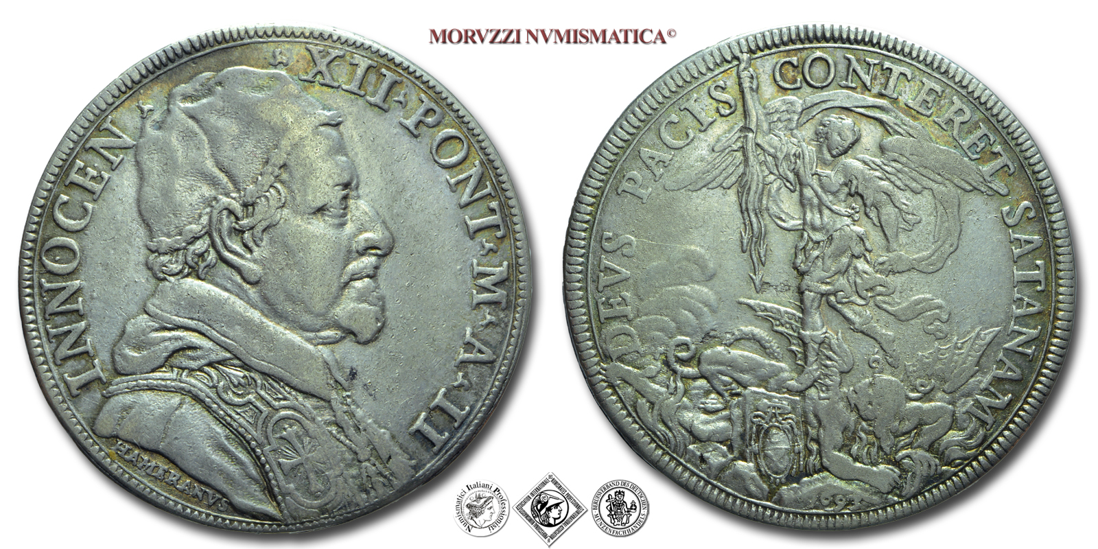 Stato Pontificio, INNOCENZO XII, Pignatelli, PIASTRA, A II (1693), DEVS PACIS CONTERET SATANAM San Michele fulmina Satana, Zecca di Roma, ARGENTO, mBB, (R), (Muntoni 16a) / monete papali rare da collezione (piastre pontificie d'argento)