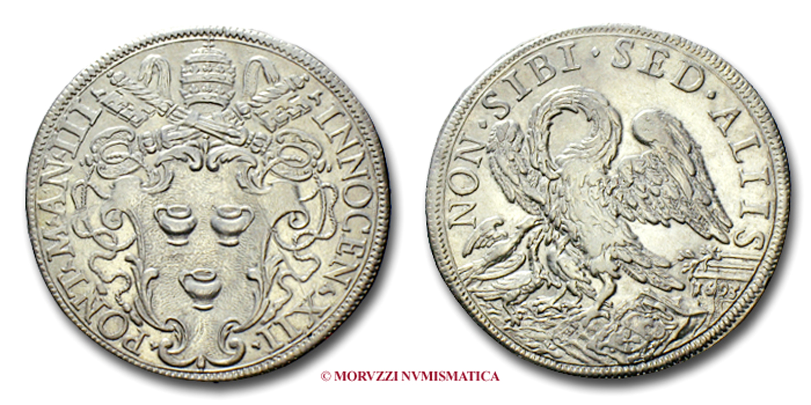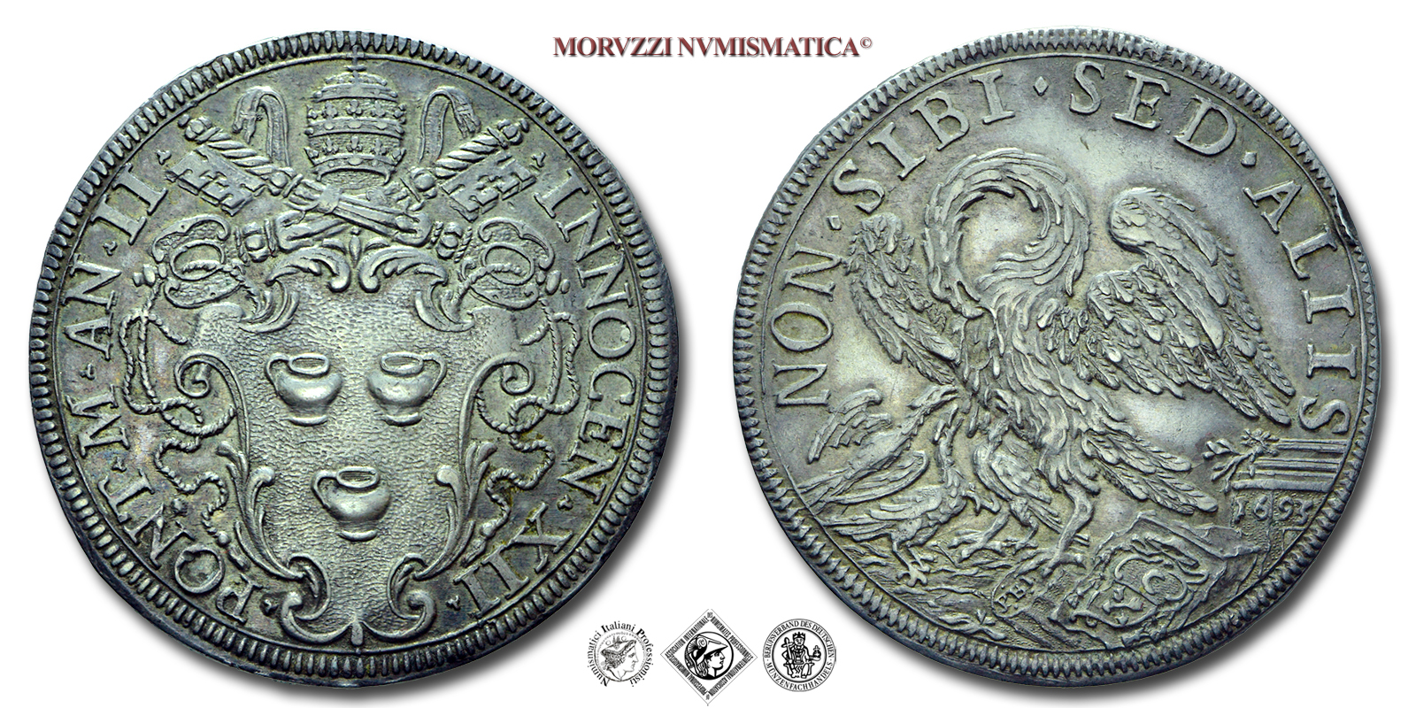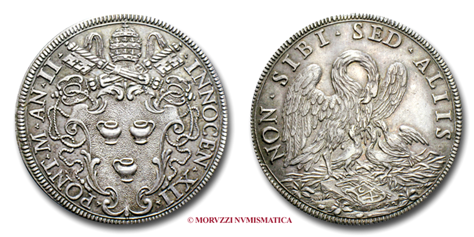 Stato Pontificio, INNOCENZO XII, Pignatelli, MEZZA PIASTRA, 1693 AN II, NON SIDI SED ALIIS pellicano mentre nutre i pulcini col proprio sangue, Zecca di Roma, ARGENTO, qSPL, (RR), (Cfr. Muntoni 34) / monete papali pontificie rare d'argento (moneta papale)