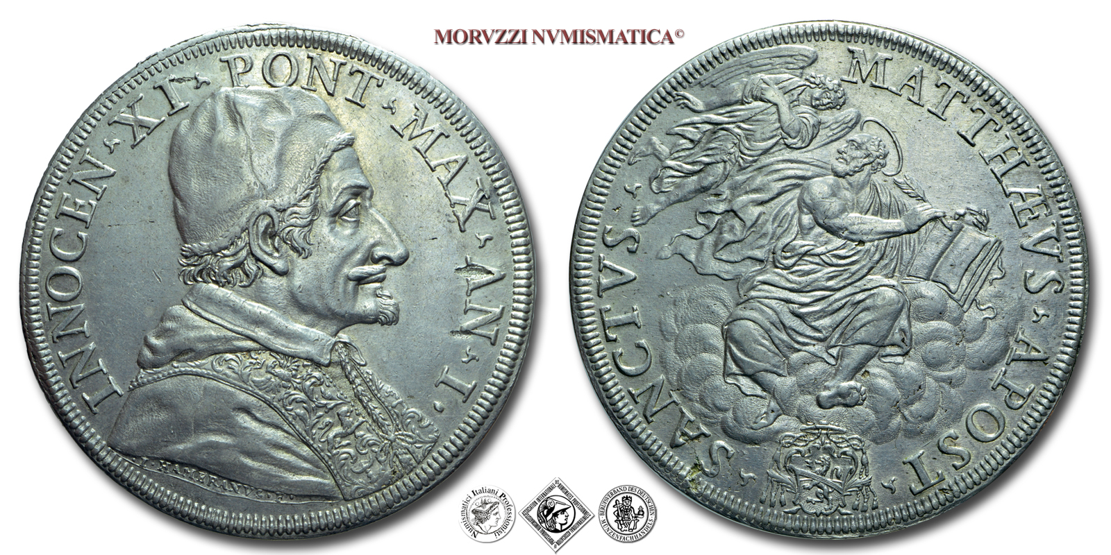 Stato Pontificio, INNOCENZO XI, Odescalchi, PIASTRA, AN I, SANCTVS MATTHÆVS APOSTA San Matteo seduto su nubi e un angelo alla sua sinistra, Zecca di Roma, ARGENTO, SPL, (Muntoni 41) / monete papali da collezione (piastre pontificie d'argento)
