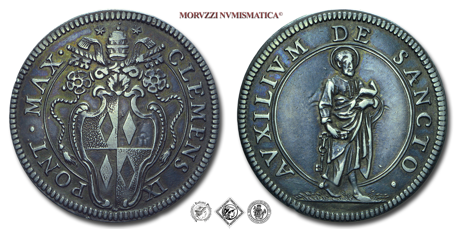 Stato Pontificio, CLEMENTE IX, Rospigliosi, GIULIO, senza data, AVXILIVM DE SANCTO • San Pietro, nimbato, lungo il fianco le chiavi e il libro aperto contro il petto in atto di lettura, Zecca di Roma, ARGENTO, BB, (R), (Muntoni 6) / monete papali rare