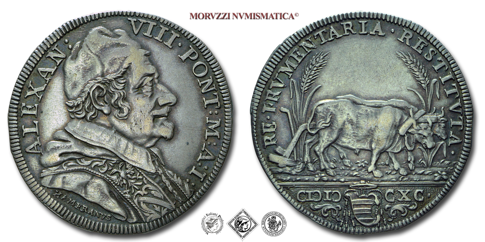 Stato Pontificio, ALESSANDRO VIII, Ottoboni, TESTONE, 1690, RE • FRVMENTARIA • RESTITVTA • due buoi aranti; in esergo: MD (armetta Patrizi) CXC, Zecca di Roma, ARGENTO, mBB, (R), (Muntoni 16) / monete papali pontificie rare d'argento