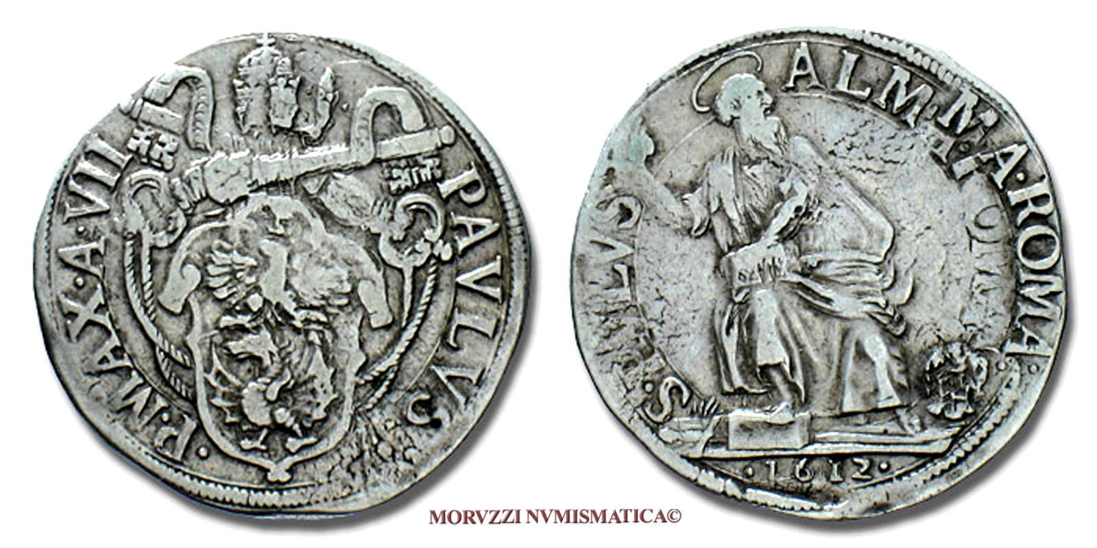Stato Pontificio, PAOLO V, TESTONE, 1612 A VII, S PAVLVS ALMA ROMA, zecca di Roma, ARGENTO, BB, (Muntoni 70a) / Papal States Pope Paulus V Borghese SILVER COINS (monete papali d'argento - monete pontificie - moneta papale - San Paolo) Papst Paul V.